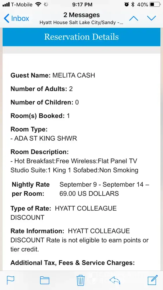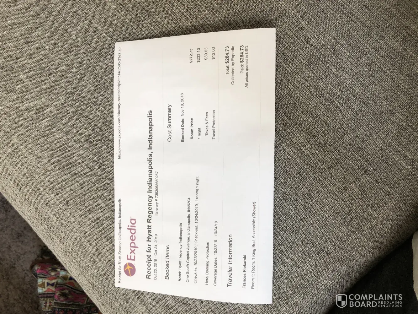 I booked this hotel stay with Hyatt Regency Indianapolis through Expedia on November 18, 2018. We had purchased tickets to a concert in another state and we were staying at this hotel for one night. The event was not until October of 2019. I purchased both the concert tickets and the hotel tickets at the same time. I can't recall receiving a confirmation...