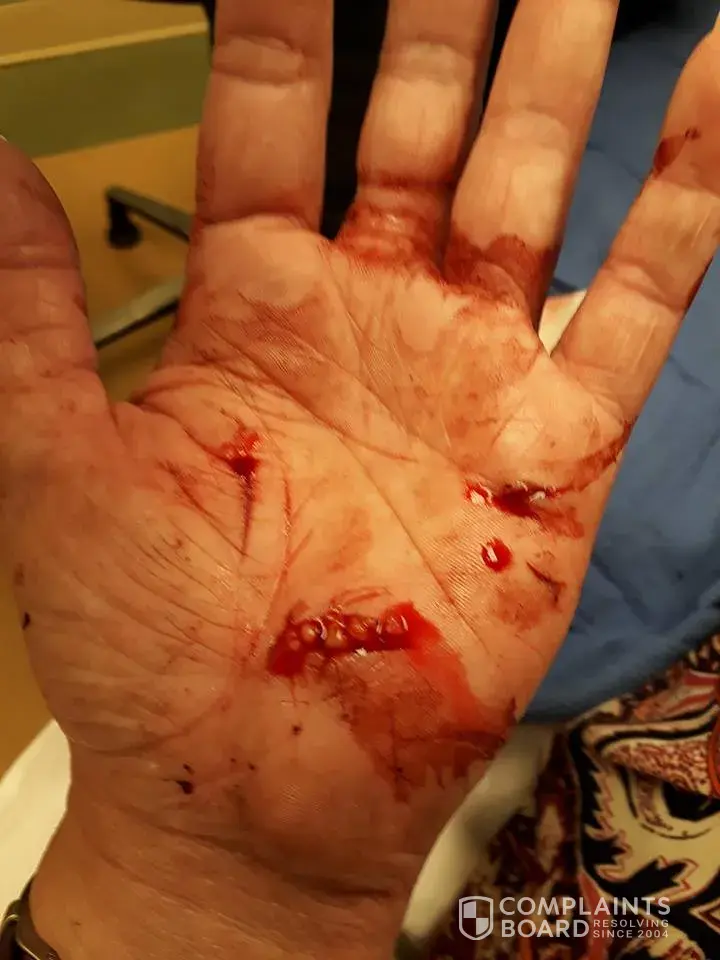 In may, my mother and I drove down from florida to visit my grandma over mothers day. We were booked for five nights, then had to stay a sixth due an unexpected injury I am about to describe. On the evening of may 15th, I was carrying my grandma's mothers day flowers to the car when I tripped on a crack in your driveway. I fell forward onto the pavement, shattering the glass vase and embedding five or six chunks of glass into my left hand. Without thinking, my mother pulled the biggest chunk out, causing blood to immediately start gushing uncontrollably from my hand.