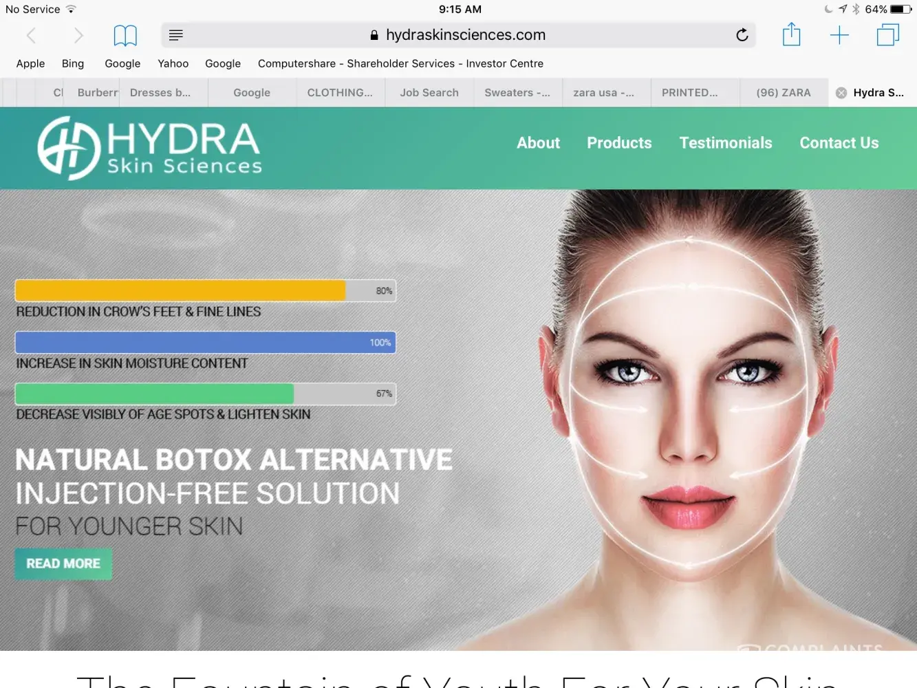 The product is just hyluronic acid and they deceive people by claiming a free trial with no obligations but shipping fees . However they charge ur cc before u can even try or call to cancel. Even though i stated clearly several times on the recorde call that I Do Not Authorize Any charges eccept the 8 dollars shipping, yet they charged my card .