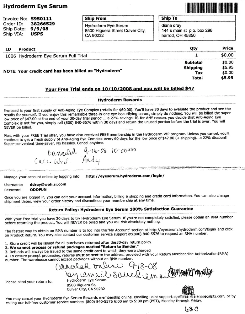 I received the trial Hydroderm product in September 2008. Approximately a month later another order was received per their contract . I contacted them and was provided with an RMA. The same day I returned the item, unopened, via UPS with a tracking number.