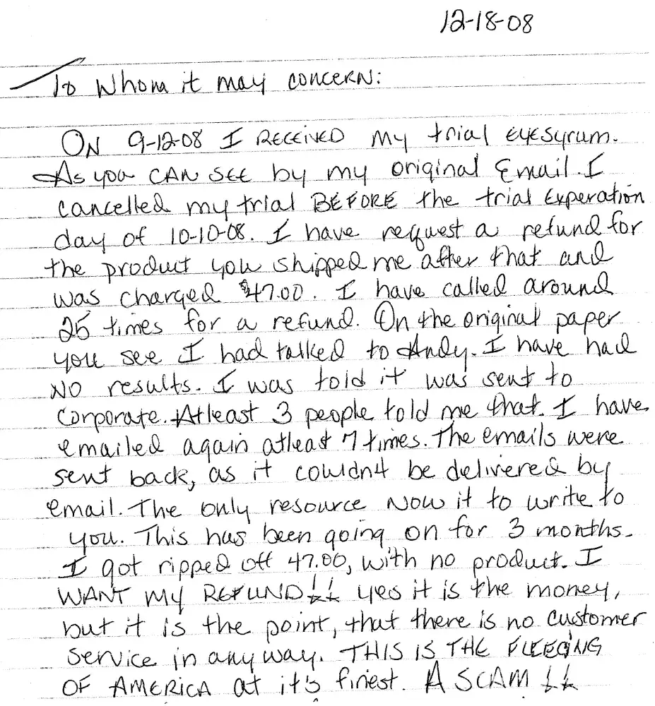 This scam is even WORSE than those complaints in 2006 I read about. I called for several weeks to get an RMA number (whatever that is) to return my unused product and NOT be billed but was told every time the "system was down" and to call back. I would NOT be billed. WHATEVER! There is no system! They billed me anyway. I was told to send it back with a tracking number. I was still billed. I found out the address is an old abandoned warehouse. I CANCELLED MY CREDIT CARD IMMEDIATELY before they could charge me another $70. These people MUST be stopped. I can't believe this has gone on for so many years. I am reporting this to the FBI.