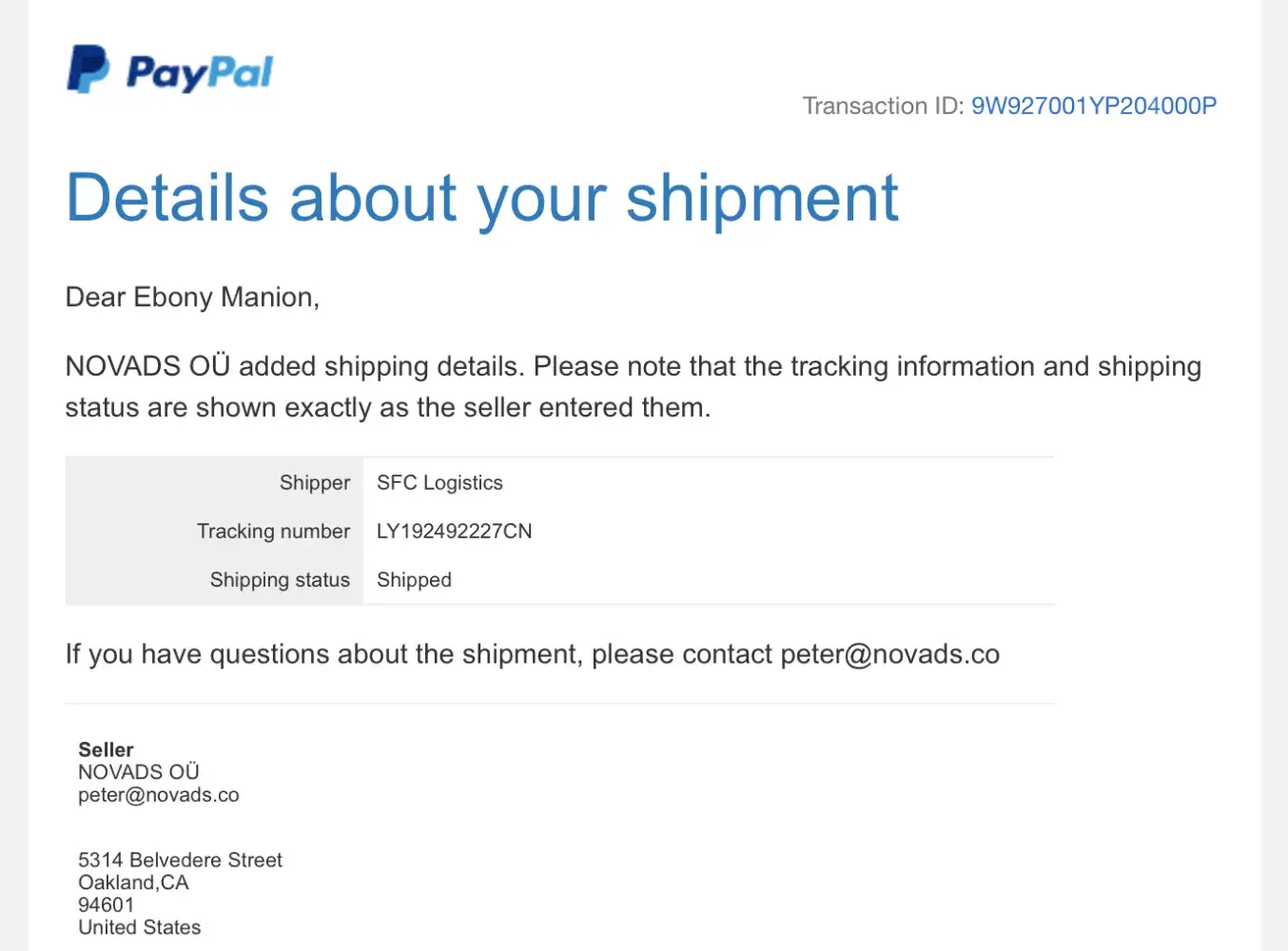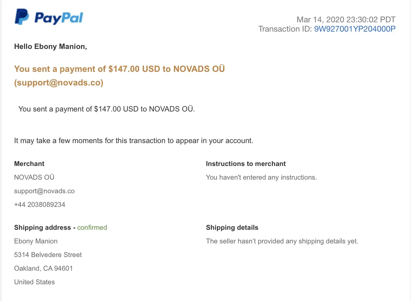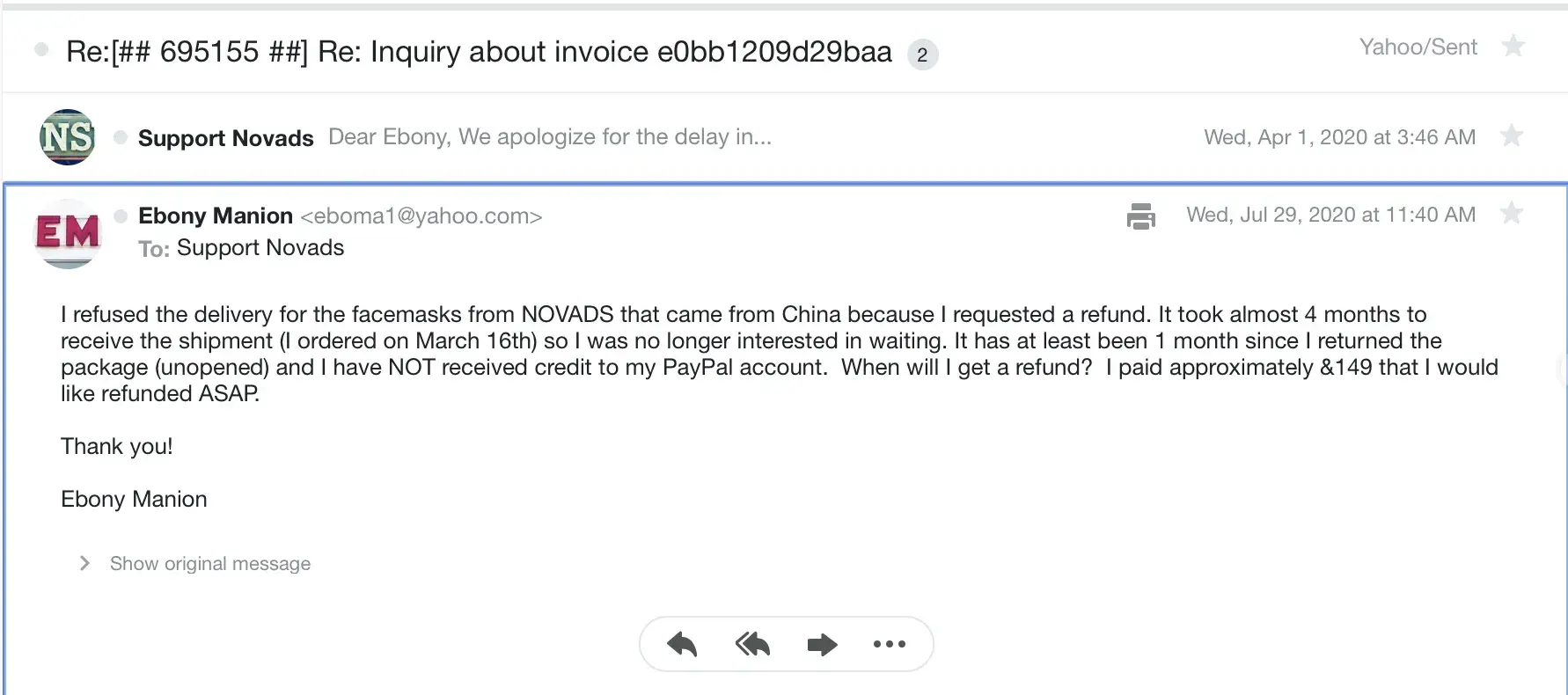 Desired outcome: Refund to my Paypal account or an official check made out in my name: Ebony Manion