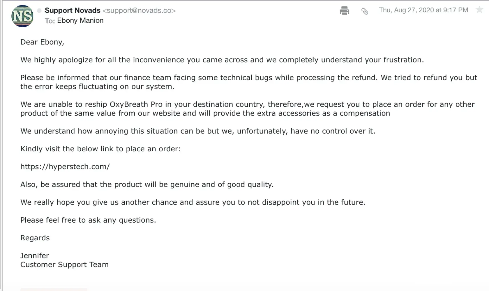 I purchased 3 Oxy Breath Pro Masks at $45 each, 2 Activated Carbon Full Layer filters at $6 each. This purchase happened on the 14th of March in 2020, when the shelter in place began. I had received an email message on April 24th that my order was on its way, but the first order did not come until July. By then I had written to cancel my order because learned that the masks were coming from China, an area where the Corona Virus first broke out. I was told by email that all I had to do was refuse the package and then I would be able to get a refund. I followed that protocol but then received an email on August 27, 2020, that I was not going to receive a refund because " the finance team is facing some technical bugs while processing the refund" so they "request that you (I) place an order for any product of the same value from our (their) website and will provide the extra accessories as a compensation". That is not what I requested or what they had promised. I sent subsequent emails explaining that I wanted a refund and not another product and representatives from Hyperstech kept acknowledging my frustration and telling me to purchase a different product from their company instead of getting a refund. Armine and Jennifer from their Customer Support team kept declining my request for a refund, citing "technical bugs" on behalf of their finance team. All I wanted was a refund to my Paypal Account, but all I got was a broken promise, lies and avoidance of the real issue. When I stopped contacting them, they swept my concern under the carpet and now I know that the company is a big scam artist. I still want my money back and I don't desire any products from a company that doesn't respect their customers!