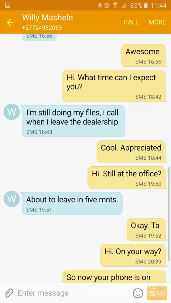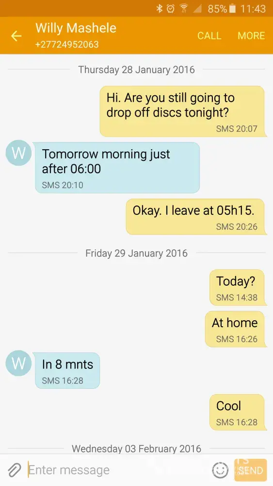 • On the 4th February 2016, I was in contact with him for the entire day wherein he confirmed that he will collect the vehicle that night at 19h00. After 20h00, he switched off his mobile.