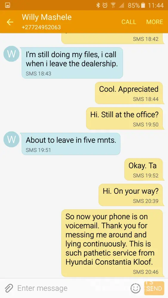 I have never, in the past 20 years of buying vehicles, experienced such disgusting dishonesty, blatant lies and customer disrespect as I have with Hyundai Constantia Kloof. Would I ever purchase from ANY Hyundai again?