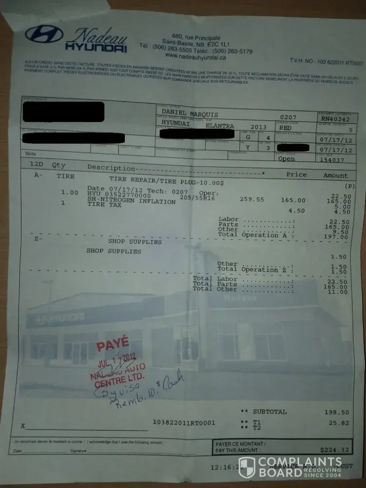 I recently purchased 2013 Elentra GL from Fredericton New Brunswick in 2013 May month. On 17th July 2013, I had few hundreds km on odometer (I don't know precise), when I was heading to Ontario from New Brunswick for vacation, near Saint-Basile city, my (almost) new tire burst, breaking inner line plastic protective frame between vehicle & tire. I changed my tire with spare one and drove to nearest Hyundai Showroom which was Nadeau Hyundai. The Service, I received who changed my perception of Hyundai's Good Customer Service to Bad Leachers.