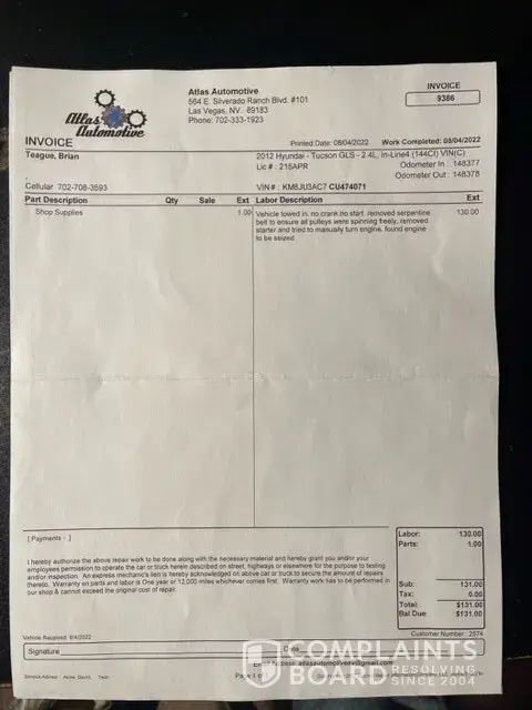 On August 4, 2022, my son was driving, and the car shut down while as he was traveling down a major road. I am thankful that he was not injured due to this incident. The car was towed to my local repair shop Atlas Automotive. Atlas Automotive diagnosed that the engine had seized. See Atlas automotive invoice #9386. The next step we took was to refer to our paperwork where we found there was a class action lawsuit recall on this issue with the engine. We were part of the class action lawsuit; therefore, we called ABC Hyundai and were advised to bring the car in. We had the car towed to ABC Hyundai on August 10, 2022, at our expense to have the engine repaired under the recall issue.