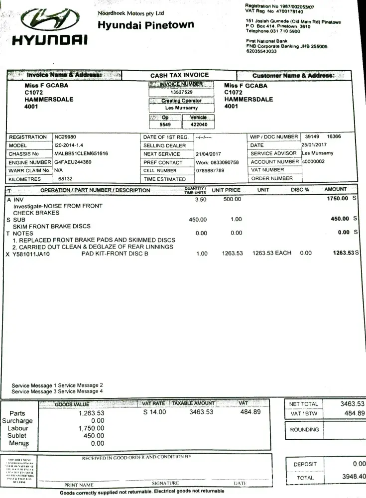 In December 2011 I went down to the South Coast on holiday to realize there is an extremely weird sound coming from my car. I went to the Margate dealership and was advised that the brackets on the exhaust were damaged and that it will take some time to receive the parts. So it was easier to have it fixed at Kempton Park Hyundai.