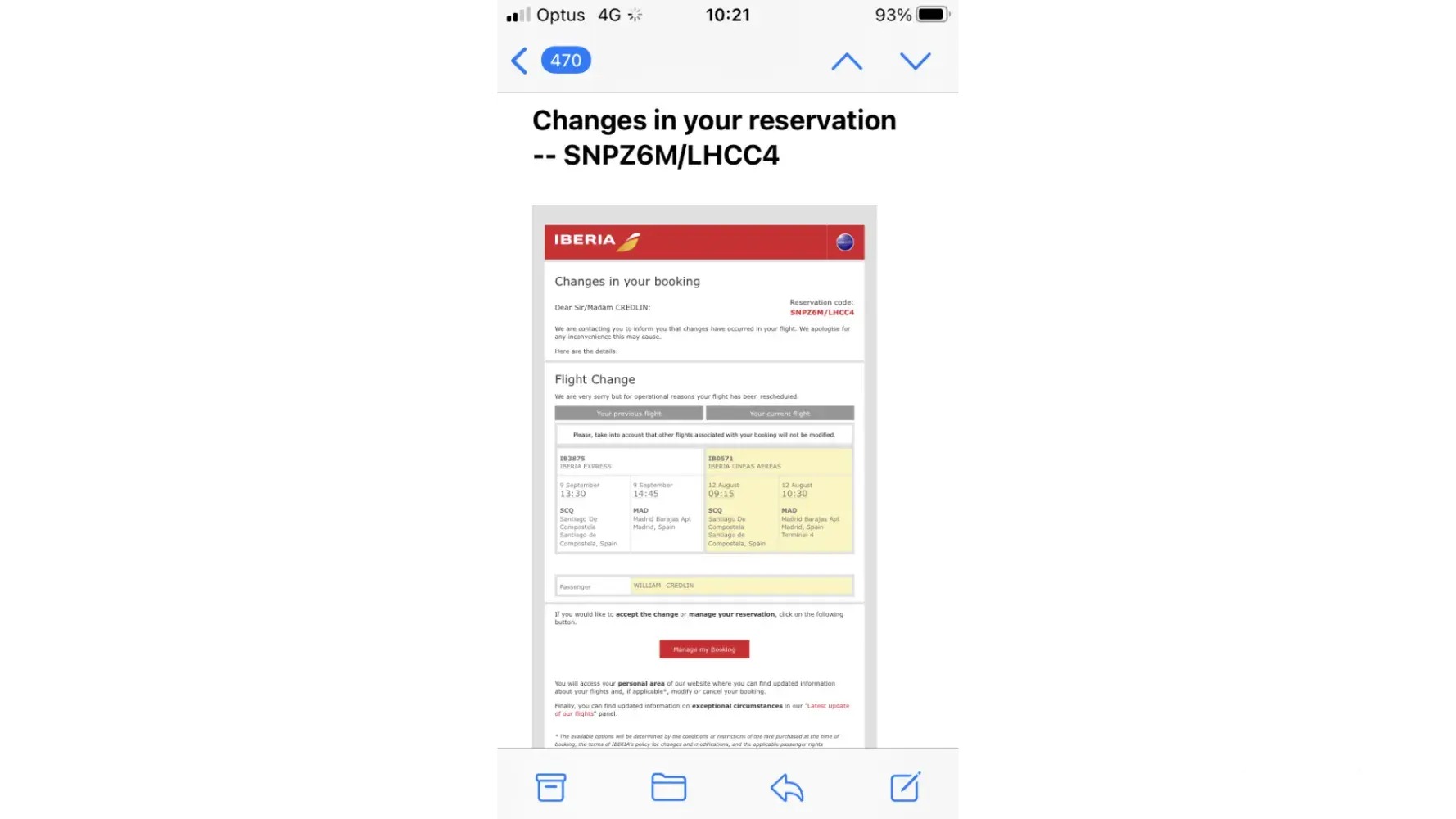 I received notification from Iberia Airlines on Thursday 13/01/2022 that the initial leg of our journey, our flight has been changed to 12/08/2023, which is 4 weeks earlier. We will not be in Spain on this date.