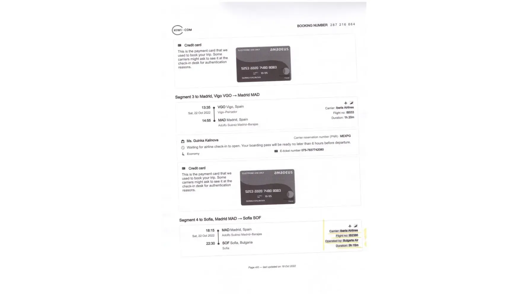 Desired outcome: Please refund prices of ticket Madrid - Sofia (IB 2386, 18.15 h on 22 Oct [protected].43 EUR and hotel in Madrid - 60.00 EUR (total 223.43 EUR).