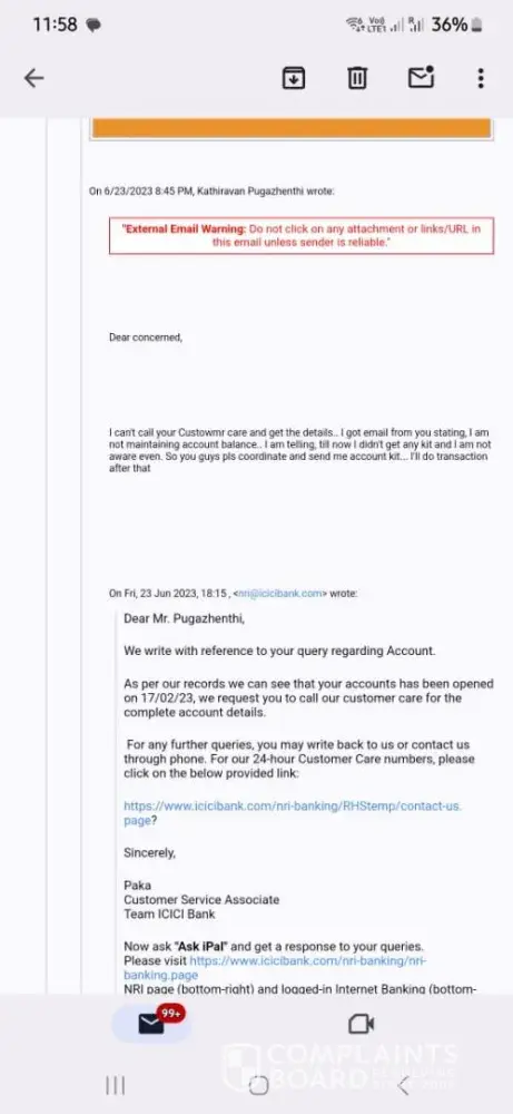 Account kit also not received. Last one year I am complaining same to ICICI NRI services. But today, they want me to pay 826 Rs as bank charges