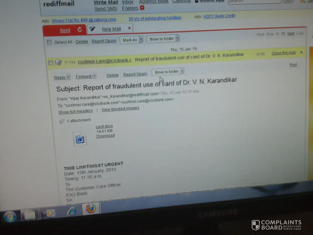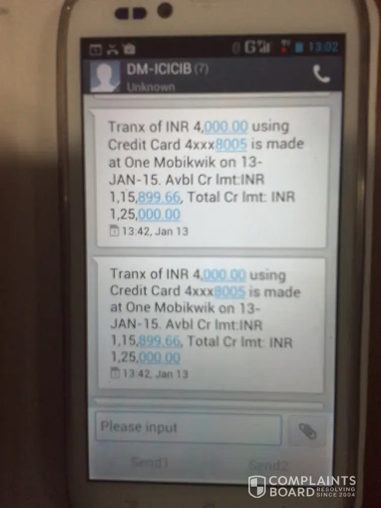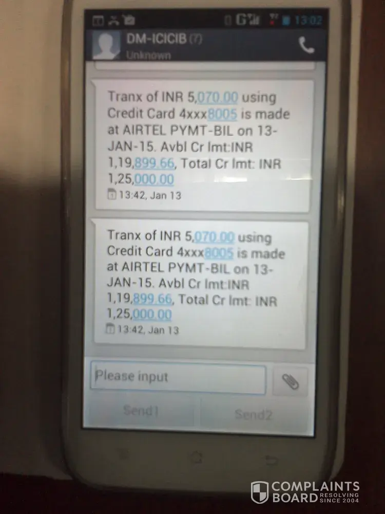 This month I have not received the sms messages regarding payment of credit card. cc no [protected]. and I am not in the city from 15th november to 20th of nov, 2014, 20th nov, i got a voice mail from Icici bank custormer care, payment of cc not yet received please pay the same to any icici bank branch immedietly by cash no charges will be layed. so immedietly i have gone to branch and payed cash.