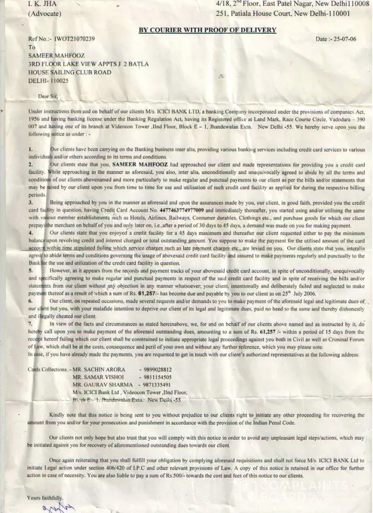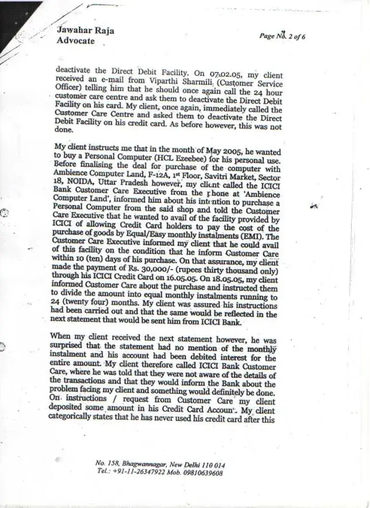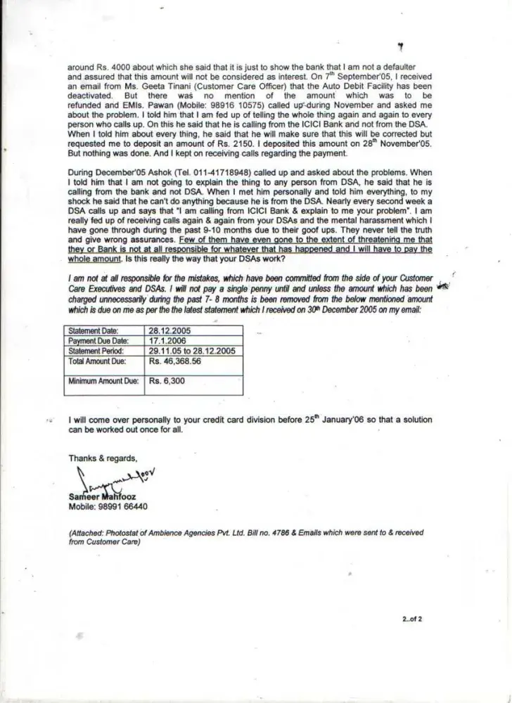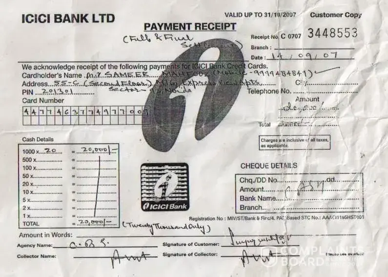 I wanted to buy 1 HCL Computer from Ambience Agencies Pvt. Ltd., F-12A, Savitri Market, Sector-18, Noida on 16th May 2005. Before making the payment, I called up the ICICI Credit Card Customer Care that I wish to get the amount converted in EMIs. I was told by the Executive that this can be done if I call them within 10 days after the purchase. Therefore, I called up again on 18th May 2005 and informed them that I have purchased the computer (Receipt no. 4786) and requested them to get the amount converted into EMIs. But later on when I received the Credit Card statement dated 29th May 2005 (attached), the amount was not converted. I informed ICICI Customer Care but the executive refused. I kept on giving the possible amounts during this time. On 16th January 2006, I sent separate letters (detailed) through Speed Post to Mr. Abhishek & The Manager, ICICI Credit Card Division, Videocon Tower, Jhandewalan, New Delhi explaining all the incidents but no one responded. Also sent an detailed email on the same date to the customer.[protected]@icicibank.com regarding this. On 25th July 2006, I received a legal notice from Mr. I.K.Jha (Advocate) on behalf of ICICI Bank. I kept on getting calls again & again threatening regarding the payments and threatening me of the consequences. When this process of harassment did not stop then I sent a legal notice to The Manager, ICICI Credit Card Division, Videocon Tower, Jhandewalan, New Delhi & The Manager, ICICI Bank, New Friends Colony, New Delhi on 9th August 2008. During this whole period I have always received all the calls from everyone who has called on behalf of ICICI and tried to explain everything. Finally Mr. Bijender called me up from ICICI & said that he is sorry for whatever harassment I went through but now wants to close this matter amicably. We discussed the amounts which I had already paid and then we agreed on the amount of Rs. 20, 000. In return to this he promised me a final settlement letter. But when the executive came to my office (Sriram Center for Art & Culture, Safdar Hashmi Marg, New Delhi) on 14th September 2007, the amount mentioned was Rs. 25, 000. When I called up Bijender, he told me that is a printing mistake and the settlement is Full & Final and requested me to mention this on the slip. He also assured me that he will issue me a new letter ASAP mentioning the amount of Rs. 20, 000 as the Full & Final settlement amount. On this assurance, I handed over CASH i.e. Rs. 20, 000 (Receipt: 3448553) to the executive. Mr. Bijender called up again on 18th September 2007, and informed me that he will not close the matter if I do not pay the amount of Rs. 20, 000 one more time i.e. the total amount for settlement will be Rs. 40, 000. At that point I was under so much pressure, tension and had faced so much harassment that I agreed to pay Rs. 20, 000 (Receipt: 3448556) more to get the Full & Final settlement done. Even after the payment Rs. 40, 000, I did not get any updated letter of Full & Final Settlement from the ICICI. Mr. Bijender stopped taking my calls and the ICICI Bank stopped sending the credit card statements to my rediffmail ID for some time but again I started receiving statements and the amount kept on increasing. I am sending the Xerox of all the related documents. I tried my best to sort this but I was always harassed, pressurized and insulted again & again from the ICICI officials. I was really shocked to see that the amount of Rs. 41, 140 due despite the payment of Rs. 40, 000. I have also requested the CIBIL authorities to intervene ASAP and help me to get this sorted for once and all...