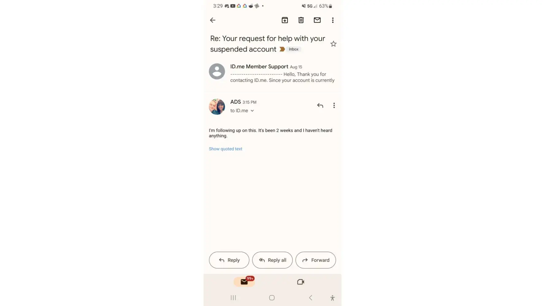 ID.me has suspended my account. [protected]@gmail.com.Contacted them on 8/7/2023 and again on 8/21/2023. Answered their questions. No response. Now I have to go to the IRS to defend my identity. Need this account restored. Tried setting up another account they have suspended all of them. This is causing me real problems in a business verifying my information for possible future employment. They say on their email that they will give a rapid response. not sure they understand rapid at all.