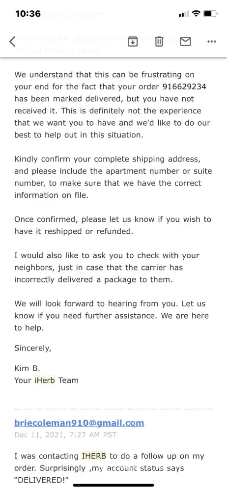 Today is Dec., 11 2021. I contacted iHERB this morning to do a follow up. Unfortunately, they're closed today. I saw AMY 23 post. I just had the EXACT SAME ISSUE ! I NEVER RECEIVED MY ORDER! But my account says "DELIVERED."