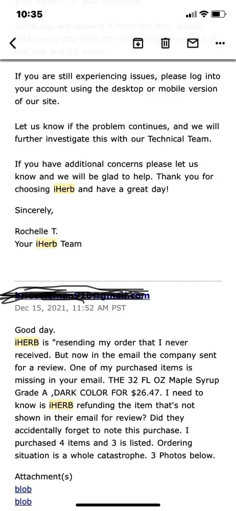 It's been a few months now and my issue still hasn't been resolved. I'm honestly so disappointed in iHerb. I used to recommend them to all my friends and family, but now I wouldn't even consider ordering from them again.
