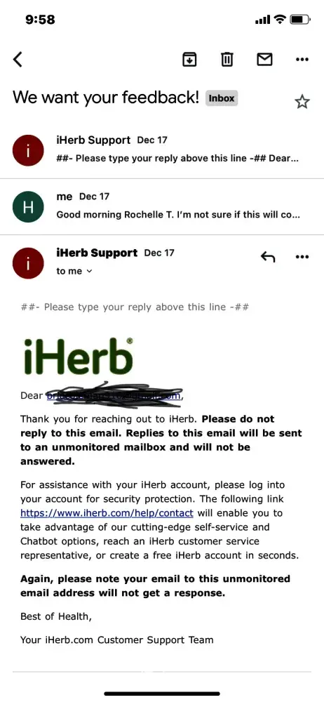 I was frustrated and confused as to why this had happened. I reached out to iHerb via email to see if they could help me fix the problem. Unfortunately, all I received were generic responses apologizing for the inconvenience and no indication that they wanted to help me get my money back. I even suggested potential solutions, such as offering me something off my next order or returning the difference in exchange, but they did not offer any other customer service options.