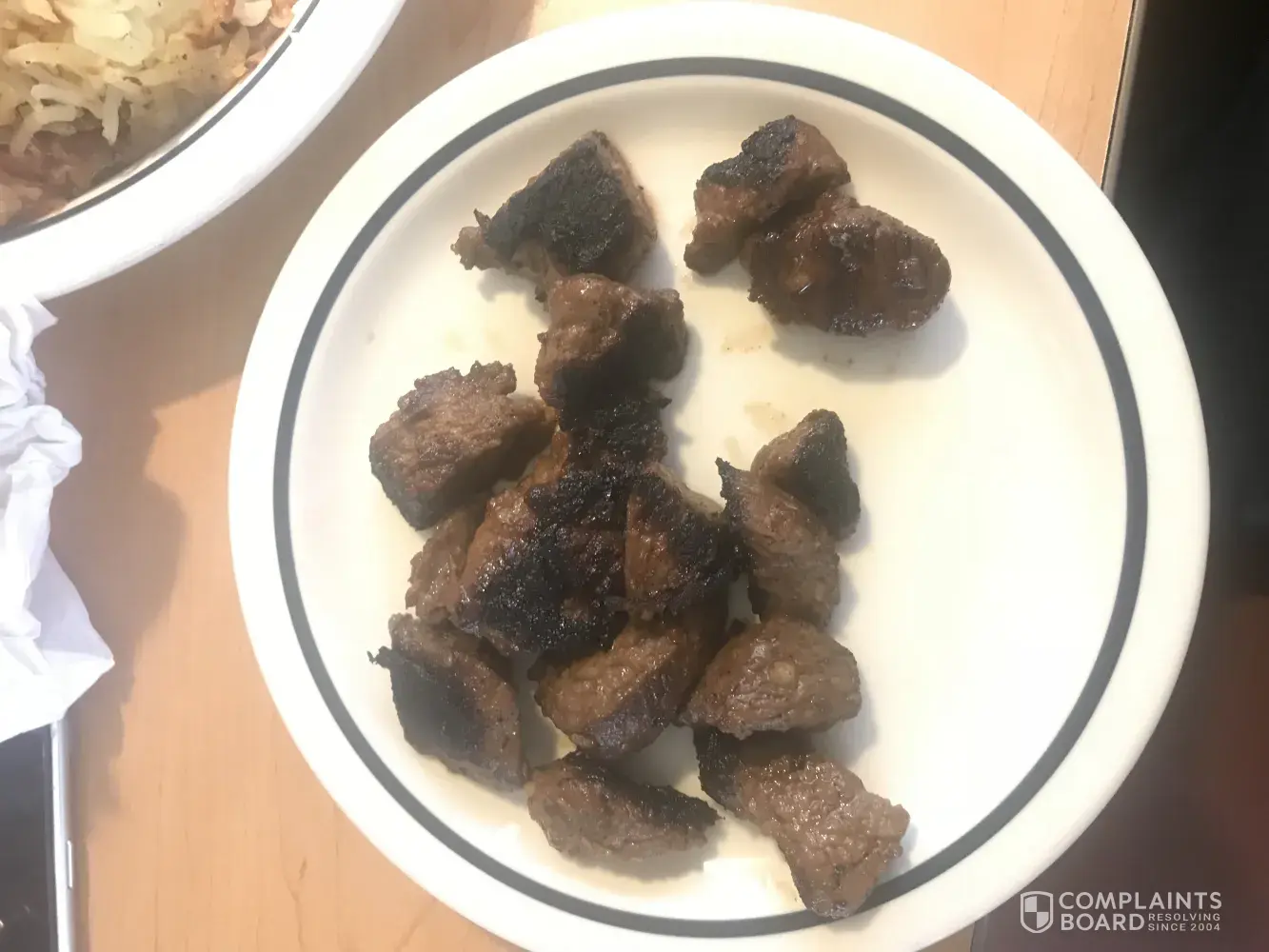 I am highly upset. I took me and a sibling out to eat and ordered the sirloin tips breakfast with no onions or mushrooms well done. When my food was received the insides were pink and had blood . I asked the waiter to cook it more so that it would be well done. When he returned my food it was burnt and hard. I also ordered the 2x2x2 and the pancakes were hard.