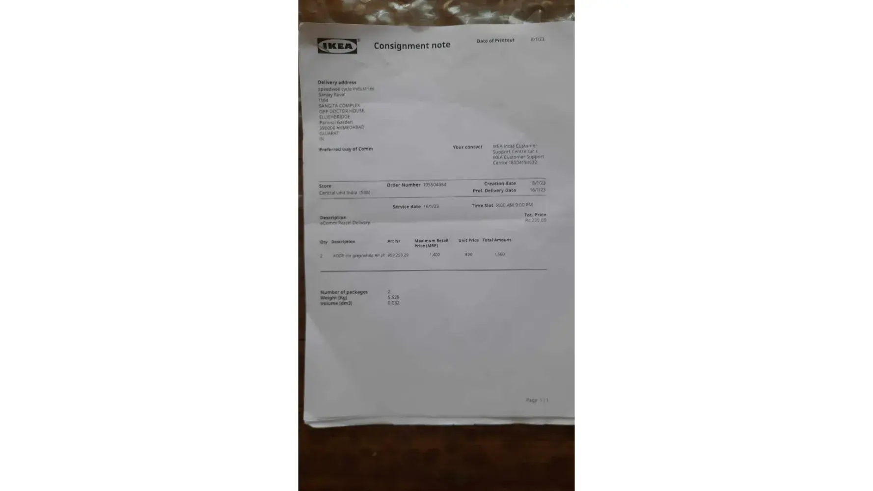 I am from India, my order details are here. No: [protected] dated 8.1.2023