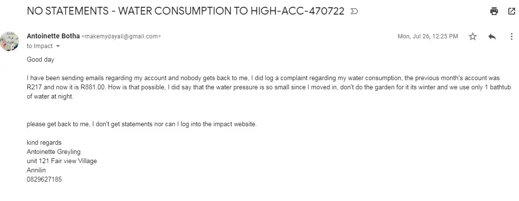 My email was met with disdain. Chante van Dijk indicated that Impact Meters cannot explain how the water is consumed, which was not the question or query. She further suggested that actual meter readings are taken monthly, which I highly doubt because I would not be sitting with this query if that were the case. They use estimations.