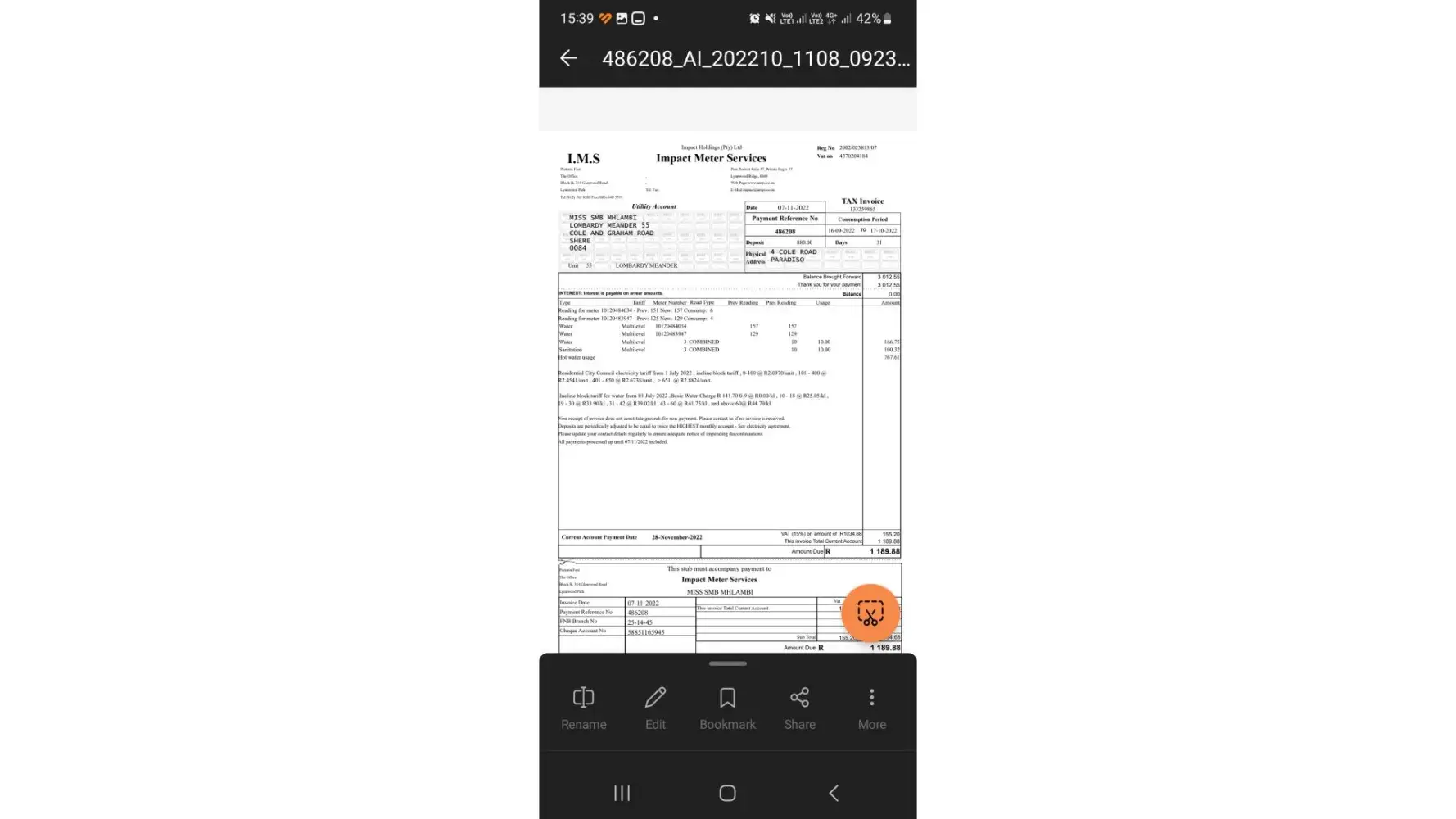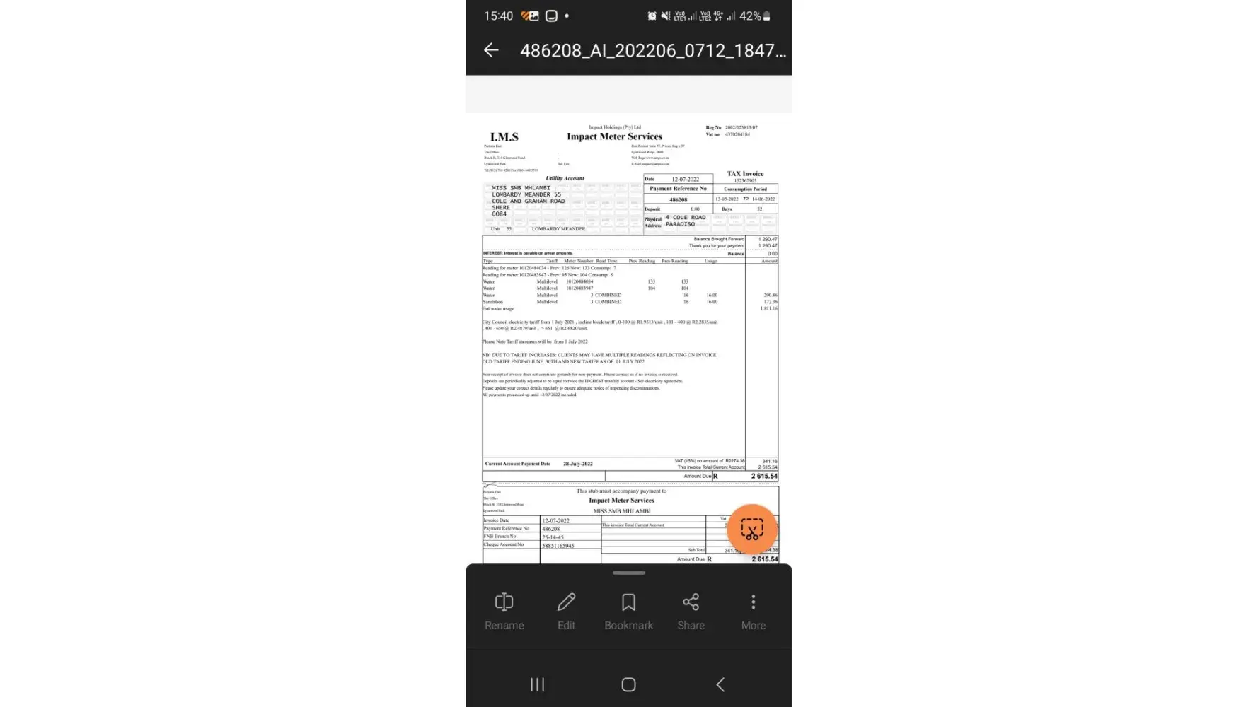 The matter was left unresolved. However, I made payment of the account in full despite not being in agreement therewith and not having the funds on hand, I maintain that the account was erroneously over-estimated. All account consumption the 6 months prior thereto ranged between R 409, 68 to R 661, 72. This on its own should be a red flag on your system, as this indicates my ordinary consumption and an estimation should certainly be within that range, not double thereon.