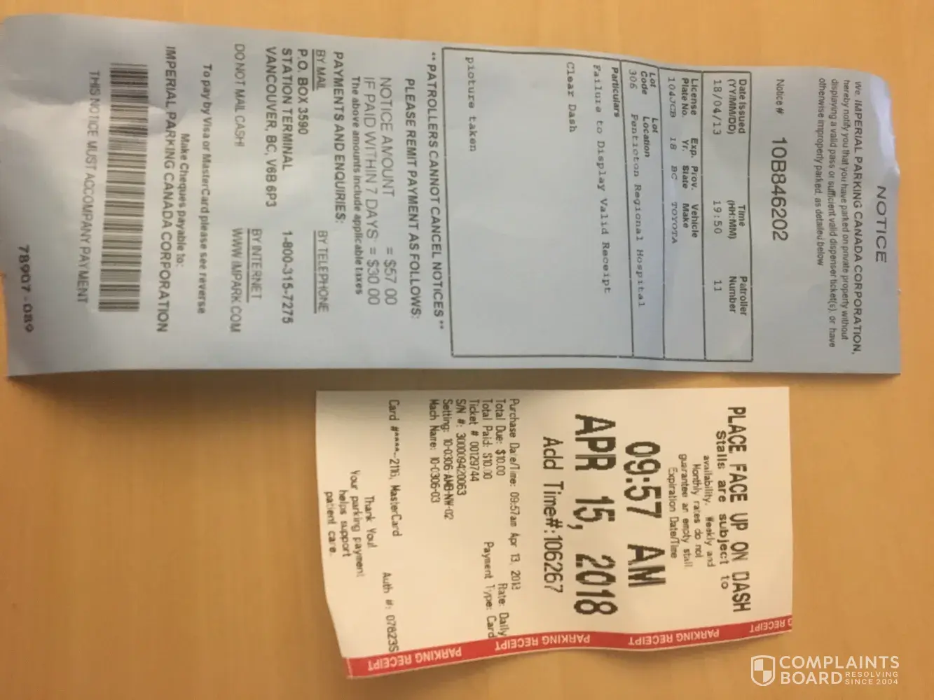 On June 16, 2017 I parked in the Impark lot near St Michael's hospital in Toronto, ON. I paid $30 to the attendant upon entering the lot. When I returned to the car several hours later I found an $80 ticket on the car. I should not be ticketed when I paid to park in the lot. I made an effort to contact Impark through their website and have received no reply apart from threat letters saying they are sending the ticket to a collection agency. I expect to have this ticket dropped as it was unfounded. Tickets aren't legitimate if they offer no complaint resolution process.