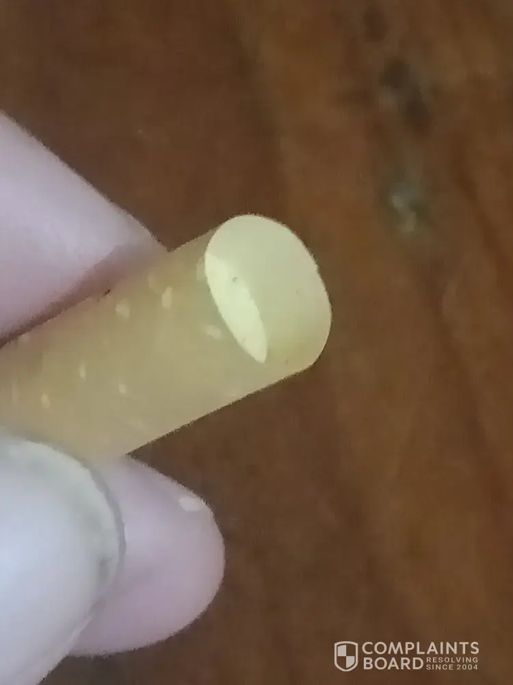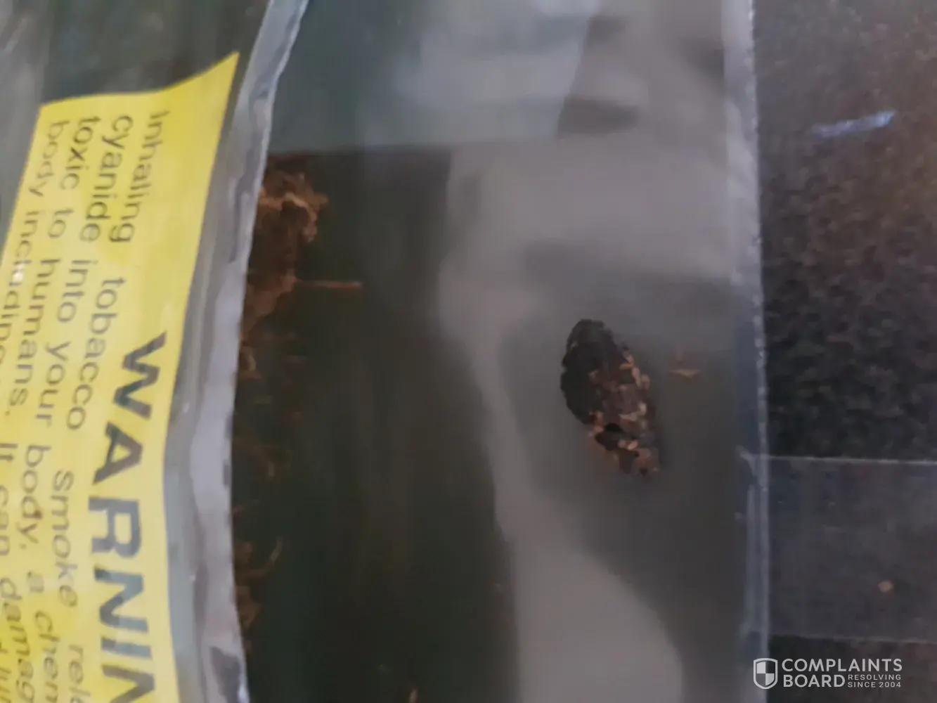 Hello, I have had this happen before but decided to complain this time. I have found 2 dark gooey hard lumps in my tobacco. Resemblance of animal faeces. I don't think I should be getting this in my tobacco. Photo taken next to Bic lighter head for size.