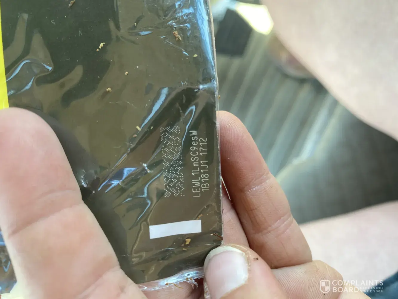 I purchased a 15 gram pouch of tobacco on the 9/12/2021 and upon opening and rolling a smoke I have found a clump of black tar like consistency blob of stuff, the batch code/number is attached in a photo along with a video of the black blob…