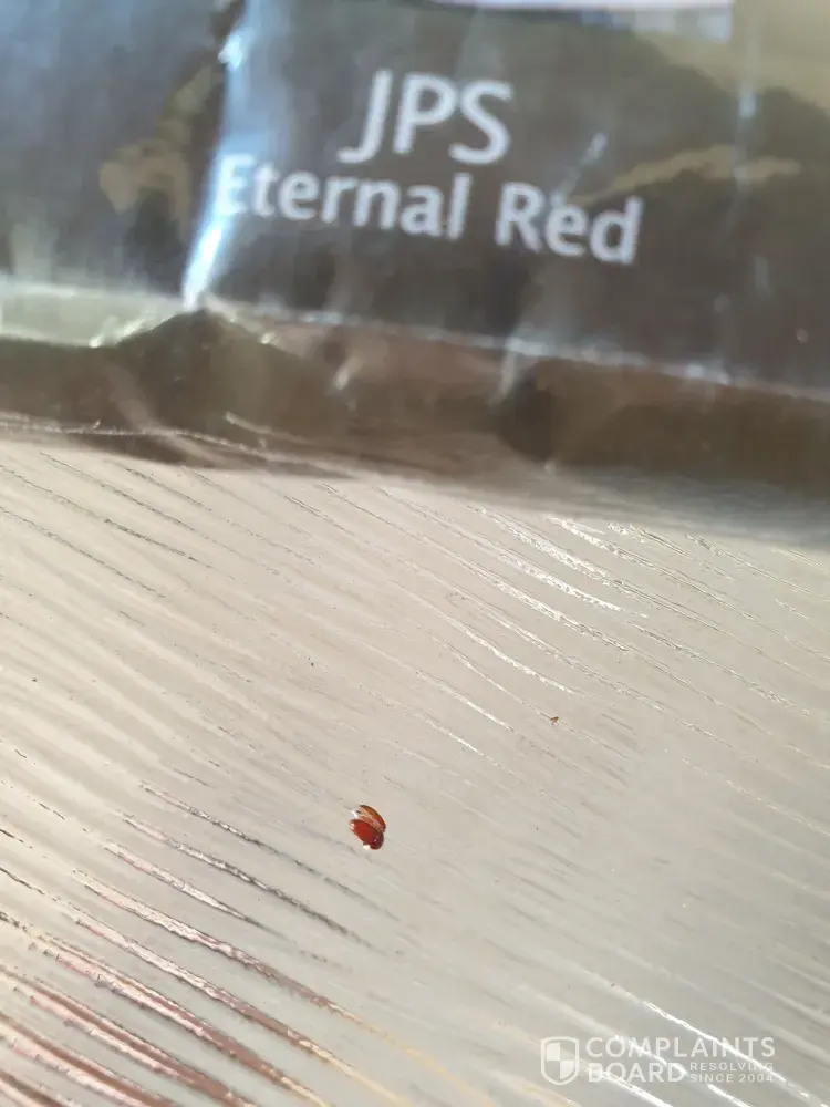 I have been purchasing JPS (red) tobacco for over 2 years now and in the last 6 months I have found several live beetles in the tobacco. The beetle is alive and living in the tobacco pouches. Attached is a photo of the beetle I found today, it's now dead as I accidentally killed it when I picked it up. It's a little brown beetle with wings. I am very concerned as the tobacco is packaged outside of Australia (are these beetles ok to be in Australia) plus the health effects to anyone who doesn't notice the beetle and smokes it with their tobacco.