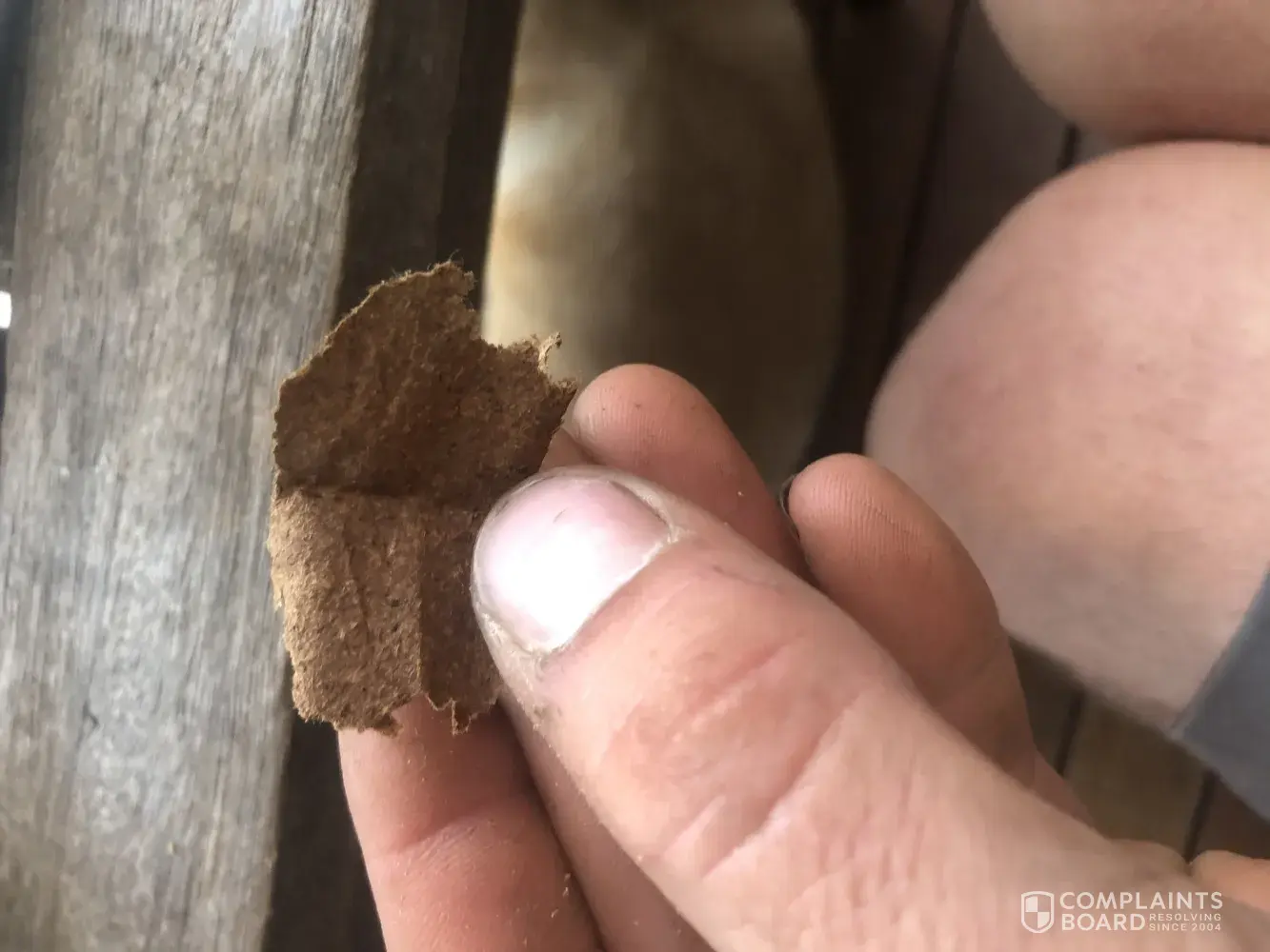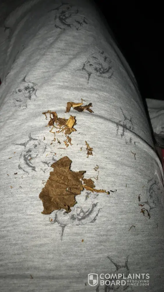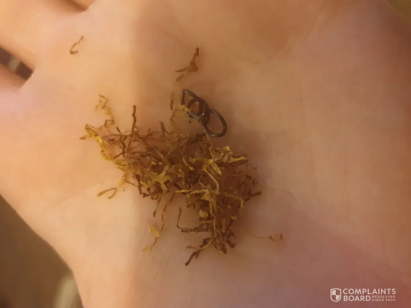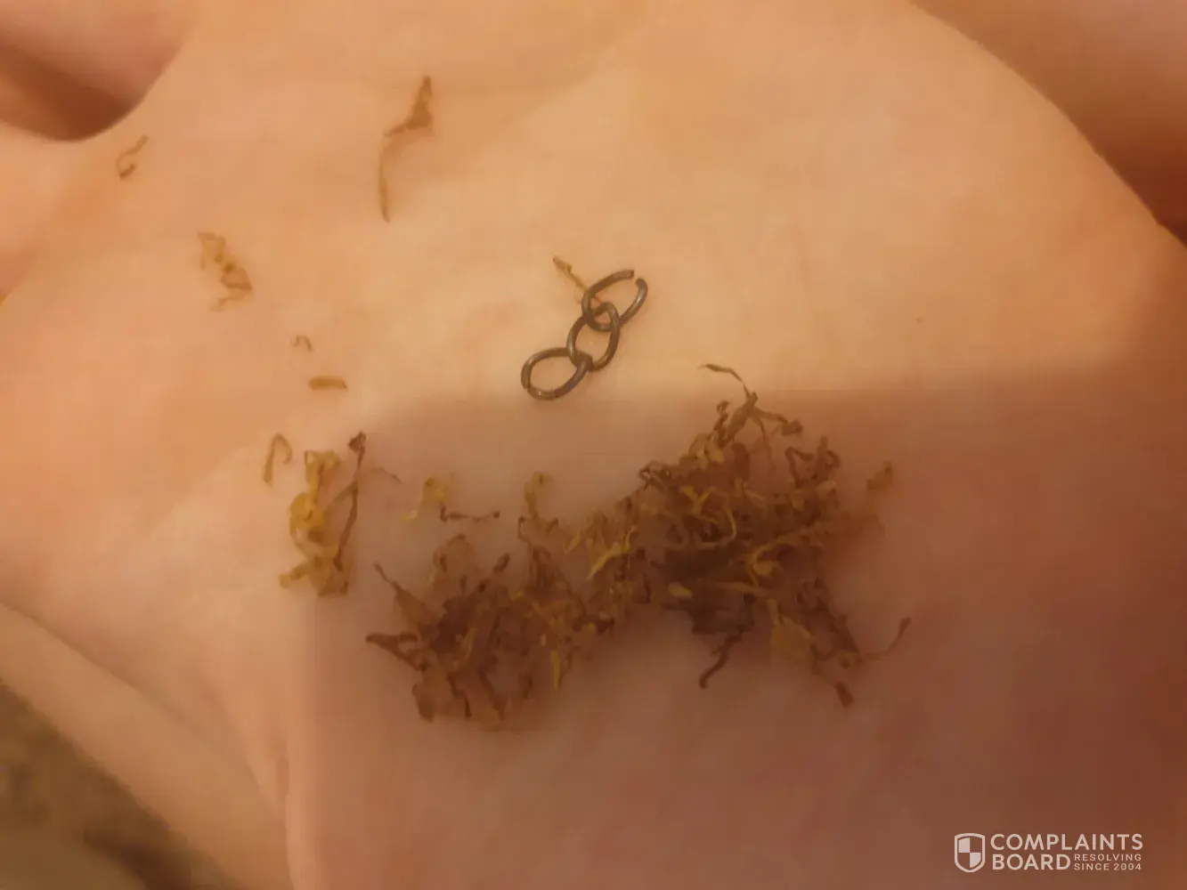 I was rolling a cigarette with my tobacco and as I'm pulling a little pinch of tobacco out of my pouch and placing it on my paper a small 3 piece of rusted chain fell with it and I dont own any chain jewellery and no one has access too my pouch so it has most definitely broken off of a worker or something and fallen into this pouch. I would really like something done about this.
