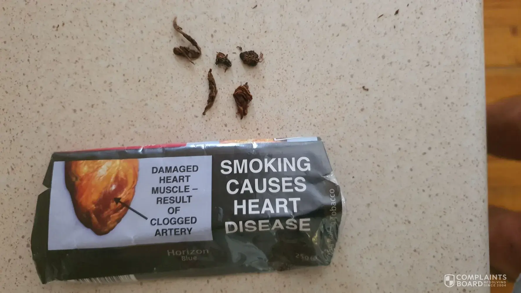 Hi there,this is the second time i have logged a complaint which of the first i heard nothing back from you regarding this issue,i have brought this brand horizon blue 25gm loose tobacco for years until last year i have been getting uncut,pieces that look like dirt,hard and crumble when squeezed,storks of hard stem,i am 51 yrs and have the liking of this brand,now i buy a 25gm every week and nearly every pack there is unconsumable product which in weight costs money.not only is it annoying but wasted money as you know tobaccoo is exspensive and i dont have the money to waste,the lastest pack also had wasted product,i have been to the point of changing brands if i find more in a new pack of horizon,but most do not have the satisfing taste as horizon blue does,now im not sure why this is happening maybe QA is not doing there job or maybe machine problem?but this is not good as i said before weight cost dollars when it comes to loose tobaccoo,i have included photos of my last two packs which contained wasted product,i will keep collecting the unuseable product as proof.please do something about this,as i probably will still get this until it is fixed.thank you kindly