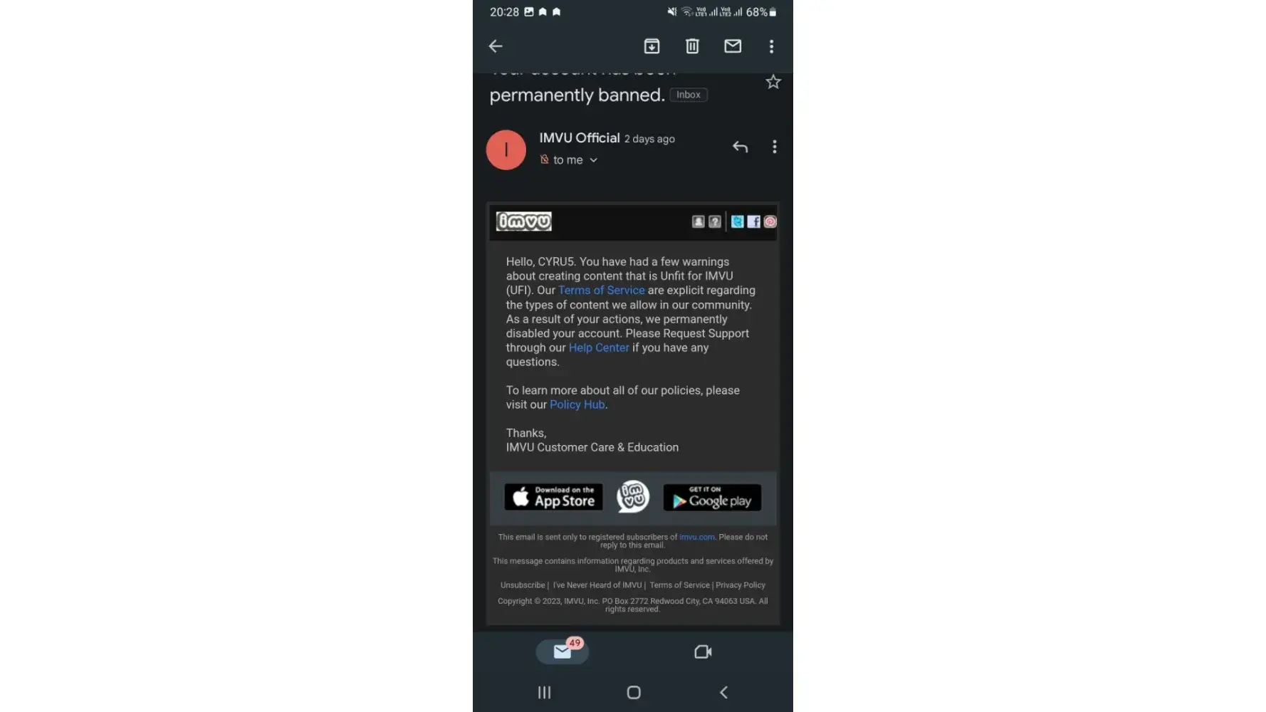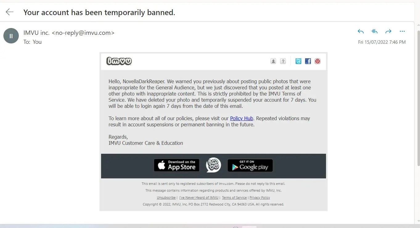 have had my imvu account for 15 years. LasciviousMel. I have bought AP. My age has been verified. I have spent so much money on my account as you can imagine...I was chilling in my room one day and we were on the topic of age. I typed. ‘I’m 33, but mentally I’m 12" and as we all know UK has banter. I was merely joking. I have never misrepresented myself as anything other than my age. 33. My account was banned. I contacted and explained my side of the story but they refuse to give me back my account. I explained that if I typed I’m 33, but mentally 80 that wouldn’t have been an issue right? I’m absolutely furious and explained it was just a joke. I don’t see myself as a child nor act like one online. They’re refusing to listen or understand and the customer service I’ve received is appalling. The levels of stress and anxiety I am experiencing from this is ridiculous. I have witnessed through my 15 years people going out of there way to create an account to harras people yet I'm the only who's banned due to a light joke about being young at heart. Where's the empathy and loyalty that I've shown you IMVU?