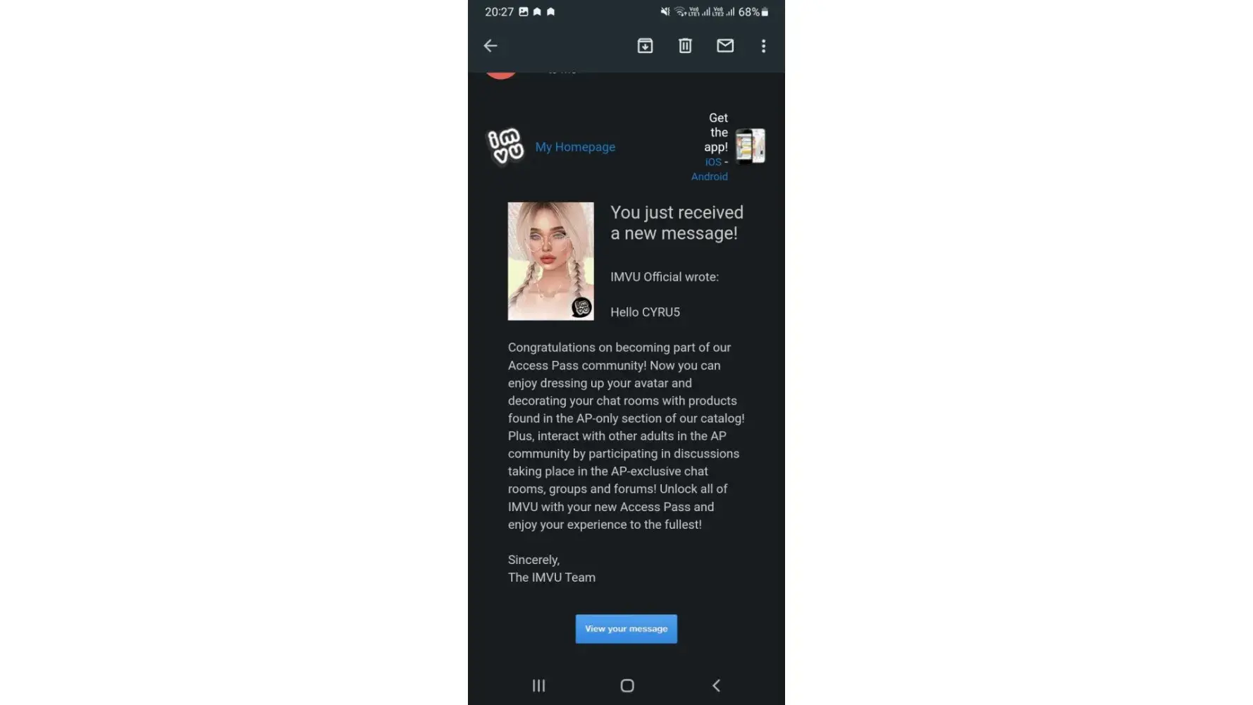 Good afternoon, I got banned because somebody was trying to get into my account and you guys emailed me to get my account back and getting unbanned thank you guys for protecting my account my avatar name is @Lunida and my email is [protected]@gmail.com and my password is teacup245. i love imvu it help me to communicate more and i met nice people this is a good game. I contacted yall and made a ticket for u guys to read also