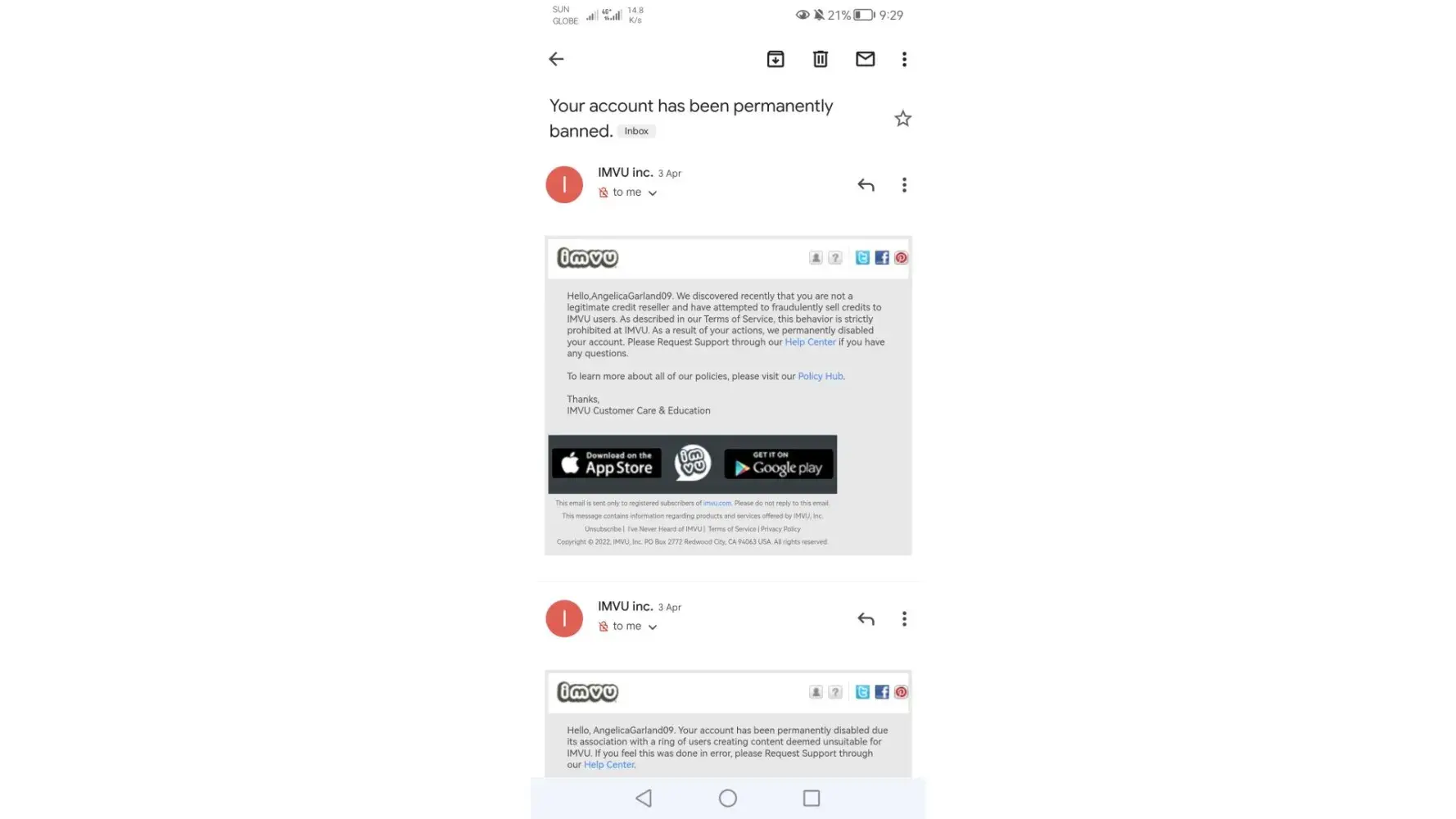 I've been an imvu player for 3yrs and my account is very expensive due to spending alot my money on credit and also I was vip and ap, then on february my account just got banned and other account too the ground said on email was I am attempting of selling credit i'm asking where is the proof that I sell credit and other account that got banned due to selling credit but they didn't sell any credit nor did i, because first I know it's illegal to sell credit and I was being careful not to make my account got banned so, the imvu help desk that i'm talking to said maybe someone gift me with illegal credit, then so why am I banned you should banned the person when gift me using illegal credit not me many of us are victims here because some imvu player gifting us using illegal credit then so why do you banned my account accusing I sell credit? Where is the fair justice here my account cost too much money I was shocked I was accusing by attempt of sell credit this is not good most of my friends also got banned because they where accused of selling credit? Which is they don't so why we have been banned for not doing so that accusations? I will not complaint if I do that's but i'm complaining because you banned a wrong person who don't sell credit there are people selling there credit who don't get banned so unfair! May account was angelicagarland09 kindly have all the investigation why is this going on imvu banning wrong account! Now how can you bring back my account that I spend too much money on that for years? Kindly have a thorough investigation on this part who are in charge of this banning wrong account must be kick out on his duty by doing this!