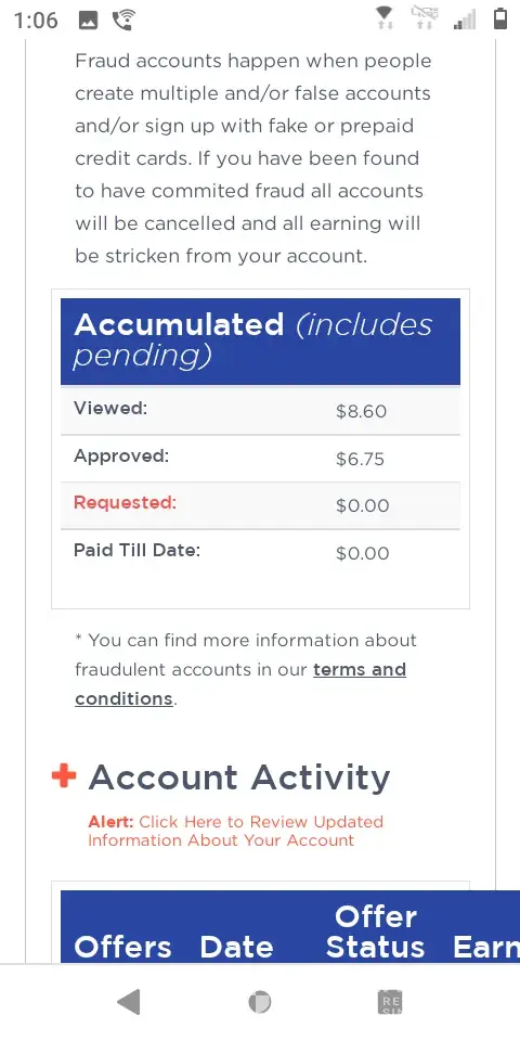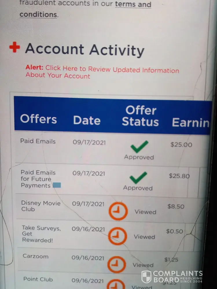 We have emaled and called, with no response in approx 2 months now, regarding compensation for completed "offers" and surveys, with screenshots of completions. We get no response, nor do the completed tasks gets added to our total. This is a bad site, as they make you reach 50.00 before they will pay out, which I have reached ONCE since joining years ago, but they say its 50.00 for just the first time, to use as a "verification" process. Yet even after the first payout, it still says we need 50.00 Am currently at 41.39 (After they update my completions) But highly doubt my total will ever get over 39.64, as that is what it has been for months, as they never add on our completions. The only thing that adds on is .05 cents and that is not consistent either .