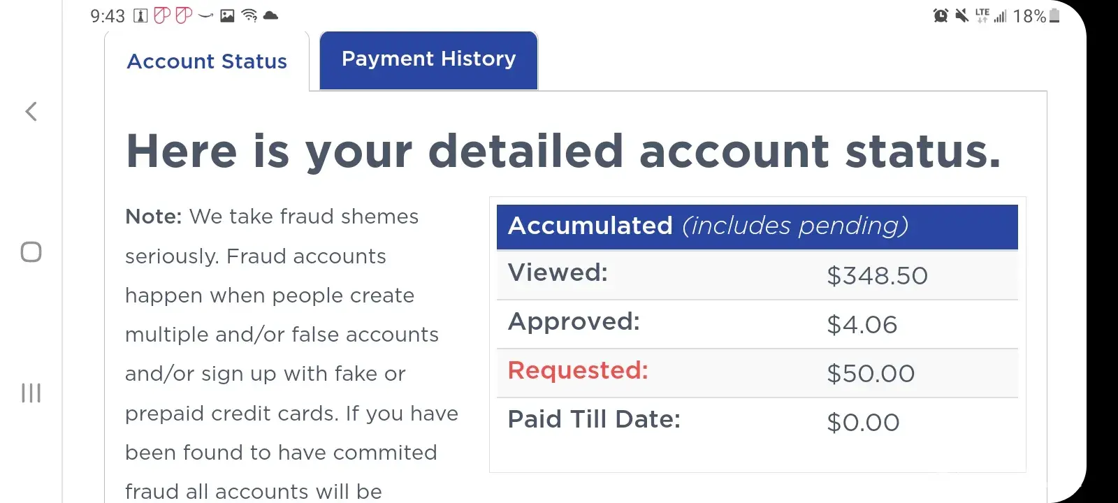 I got 64.95$ and I cashed out to get it and it has been waiting to approve the 50$ which is all it MST be willing to handout so I have to earn more to cashout again, I suppose that's fine but its been a week now and I'm trying to contact the company now this aught to be resolved and paid to me. I need it to bad