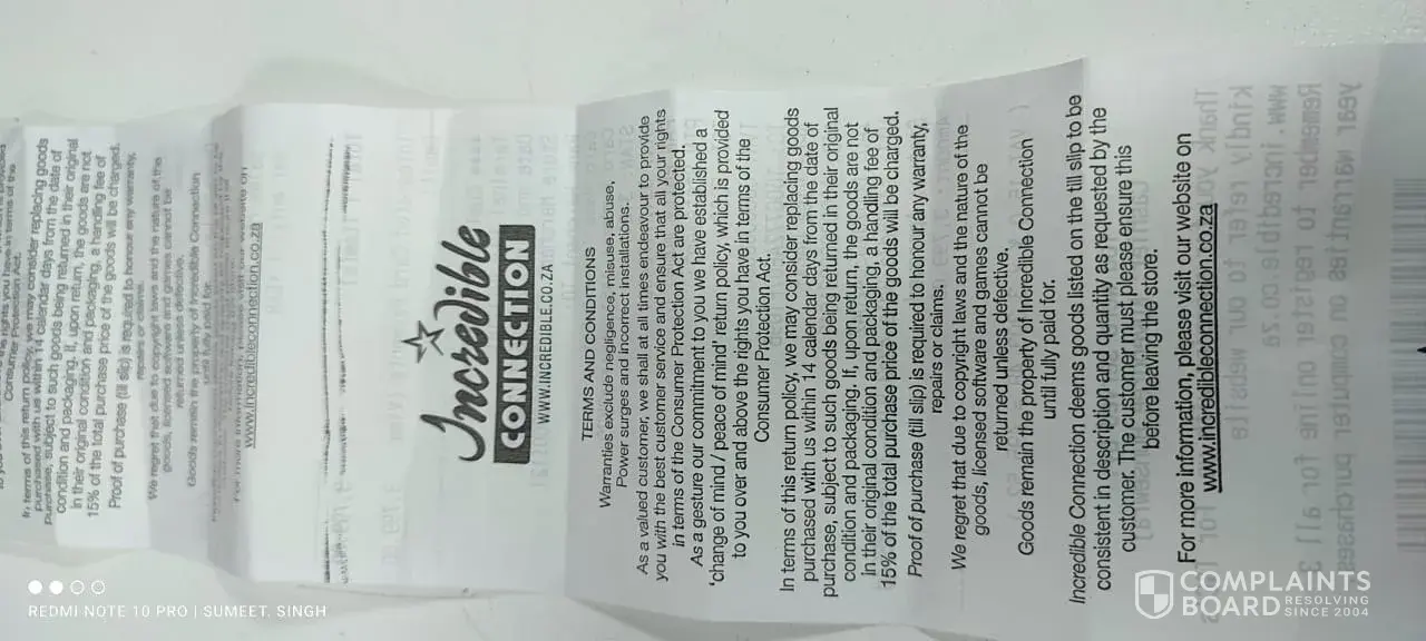 Dear,I would like to bring to your attention the unfairness and ridiculousness of your return policy. I purchased a JBL soundbar on Tuesday, 27th June and returned it today Friday, 30th June in good condition and packaging. In actual fact I returned it in the same packaging that it was sold to me. Despite this I was charged a handling fee of R569.00 for no reason. Your consultant in the store David, said the minute the box is opened and if returned the handling fee is charged to the customer which makes no sense. 2 weeks ago we purchased a tablet that was opened in the store. Had we returned the tablet, would we still need to pay handling fees despite this being opened by your employees? When I asked for further details, as we were never informed of this return policy, none of your employees could answer me. According to them the minute the box is opened a handling fee is charged. So how is a person suppose to try a product without opening the box? According to the consumer protection act we should not be charged 15% handling fee. We have purchased tablets, cellphones, laptops and never had this issue before but from this day forward I will inform all my family members,friends and go on every social media and report this robbery to a dedicated customer. I will never purchase from Incredible connection and I will ensure every person knows of your ridiculous return policy.