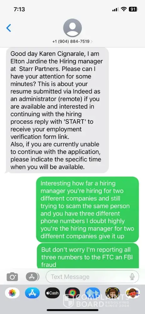 I have received 4 text messages from 4 different numbers all requesting via text links to apply and asking for personal information and to give passwords and users names to idme.com when I go back those jobs don't exist anymore -- interesting and they are using a name of a Realtor in Canada. 230 people applied for a job with starr partners that did not even truly exist along Fall Creed Dentistry and Mobile link companies all scams How is indeed protecting customers looking for a job? I reaching out to local media and media in Texas where indeed supposedly has a main office yet no email or phone number to contact. I am also reaching out to FBI Fraud