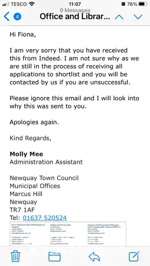 On 2nd July I received a message telling me I hadn't been successful, this was confusing as I hadn't yet applied! I also saw the job still being advertised on other sites.