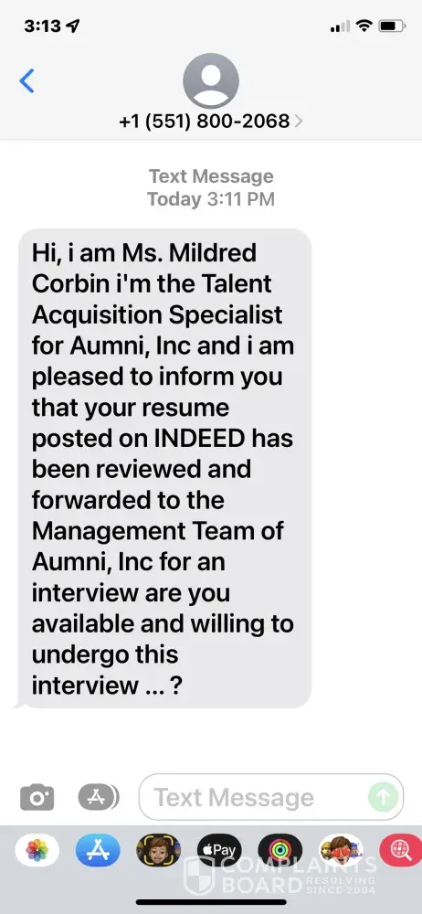 Was contacted by a Ms. Mildred Corbin stating she is a Talent Acquisition for Aumni Inc and that she saw my resume on Indeed.Com and it was forwarded to their Management team at Aumni Inc, then I received a message on WhatsApp from a Ivan Fanucci stating he was the Interview Manager, he asked me typical interview questions about my previous work and then listed the different software's that are out there if I knew how to use them one being QuickBooks. They then waited one day and offered me the position of Remote Administrative Assistant, they then proceeded to send me the front and back copy of a Cashiers Check for $2, 300 and asked me to deposit it into my checking account through my Mobile account. They even talked about medical, dental plans, even paperwork for a background check! They were very professional until they sent me the check for Office Supplies. What a very disappointing world we live in nowadays!