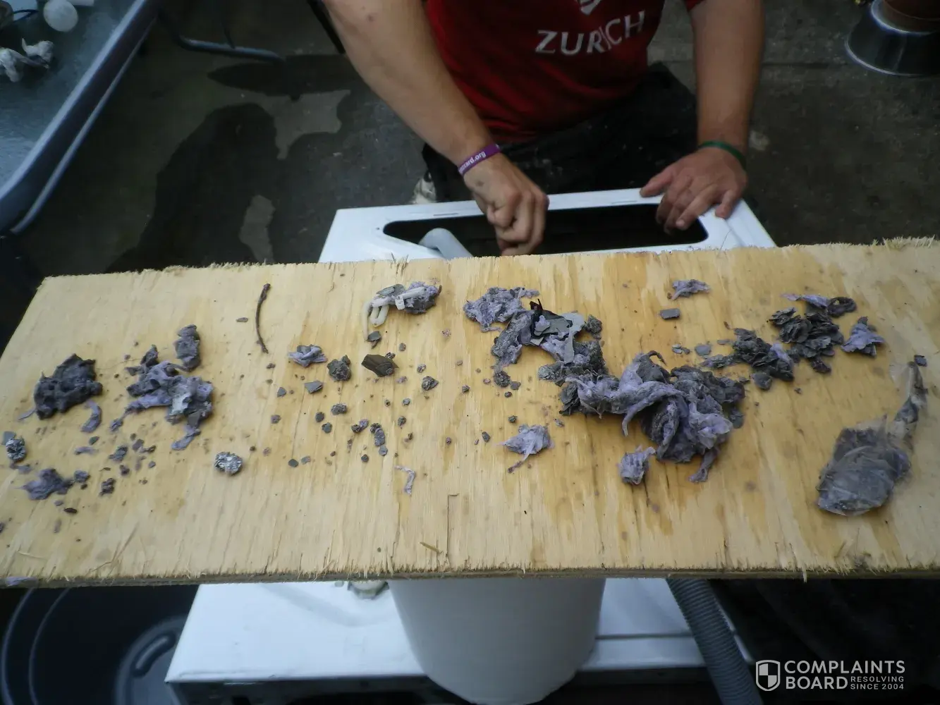 I have peronnal insurance on my washing machine, indesit are there engineers, I reported the fault, was told they would come last friday, nos how, he phoned at 4.45 to say he hadnt come as he had been broke down, he would come on the saturday, no show, numerous phone calls later it was arranged for them to come wednesday last, engineer told me what I had to do, hence kitchen full of water and sudds that evening, spent all thurs morning doing what he said I had to do, still no good, phoned my insurrers again and they said the earliest indesit could fit me in would be next wednesday, no good to me in a family of 4, 3 being males, my husband works away hence the reason we took oput insurrance, my son and his friend seeing the state I was in set about to look at the washing machine, to find the filter blocked, why didnt he check the filter, to me he is incompetent and so is the company he works for. I hasten to say my son has never looked a washing machine before. I have been very emotinally upset over all this. He even suggested I take a photo of the said mess in the filter, enclosed.