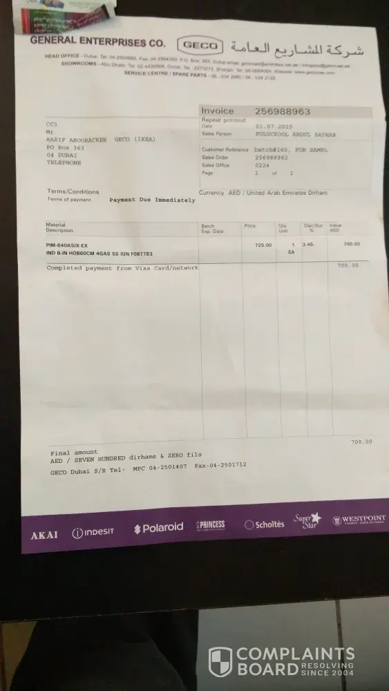 On saturday 12th august I brought a indesit gas hob for aed 1, 599 which was delivered on 14th at 9.45pm. The item delivered was a used and damaged unit.