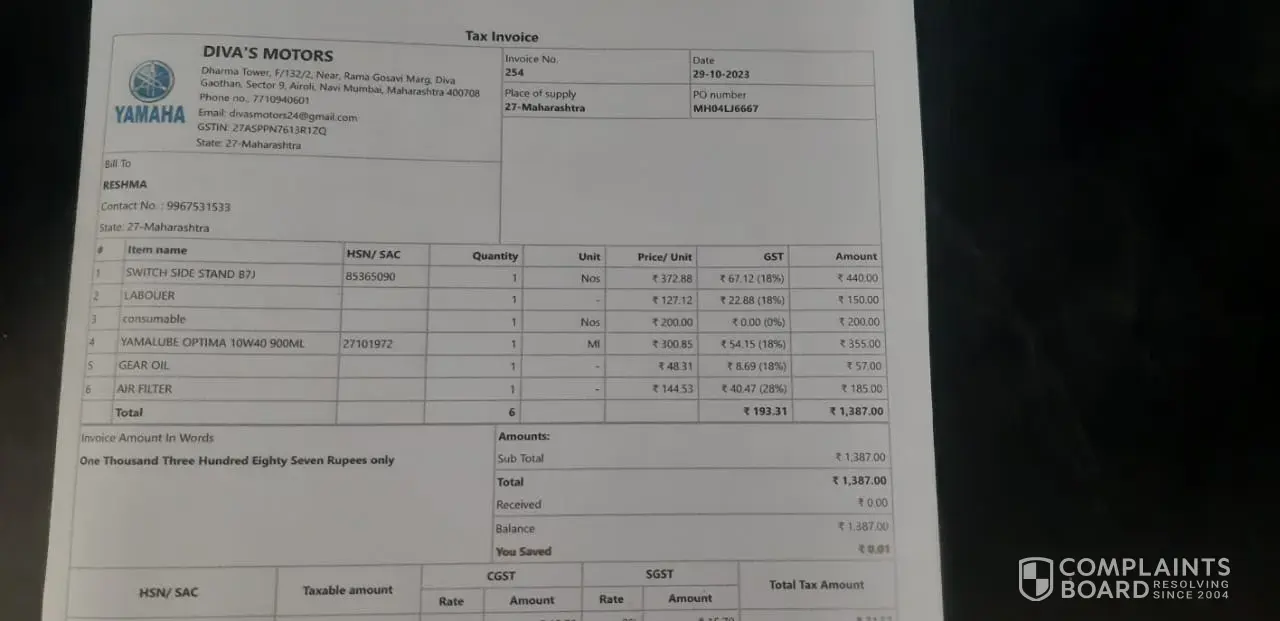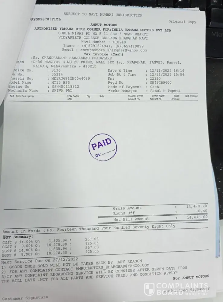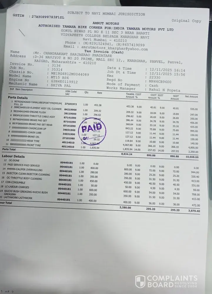 Dear Team, I regret having to write this email, but I am deeply concerned about the continuous overcharging by your dealer, Amrut Motors – Yamaha Authorised Dealer in Navi Mumbai. Their service costs are excessively high, and it has become quite frustrating. I had already stopped servicing my bike there due to the owner’s unprofessional behavior and...