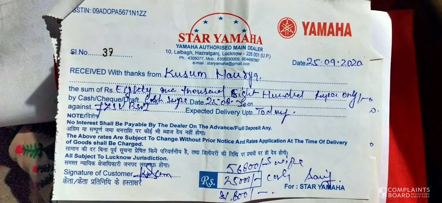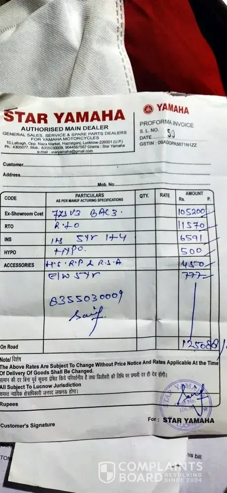 In 25 sept 2020 I finance a motorcycle fzs FI VI the person whos name is saif he work in star yamaha (address:-10, lalbagh opp naza market hazaratganj lucknow 226010 Uttar Pradesh.) He sell me that motorcycle in rupee 1, 25, 088. I pay Down payment 80, 000 thus the left ammount for loan is rupee 45, 088 but he make a loan rupee 47, 000.