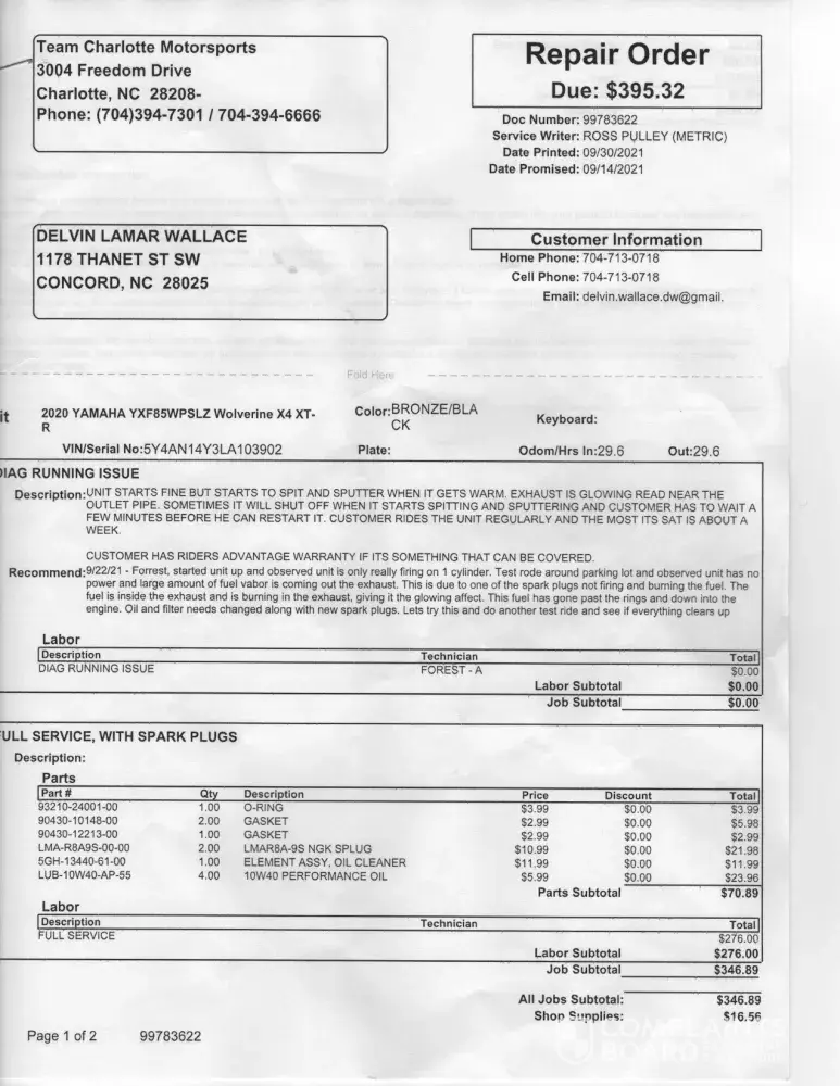 I purchased a 2020 Yamaha Wolverine X4 XT-R, along with a Riders Advantage extended warranty, suggested by Team Charlotte Motorsports with the purchase of my new 2020 Yamaha wolverine. With less than 30 hours of riding time, I had to take it back to the dealership for repairs and it was determined by the dealership that my SXS is only really firing on 1 cylinder, unit has no power and large amounts of fuel vapor is coming out the exhaust, due to one of the spark plugs not firing and burning the fuel. The fuel is inside the exhaust and is burning in the exhaust, giving it the glowing affect. This fuel has gone past the rings and down into the engine. Suggest: oil filter needs changed along with new spark plugs; let's try this and do another test ride and see if everything clears up. At present, cost of repairs is $400 and no guarantee. I'm told by the dealership and Riders Advantage that my warranty doesn't cover such repairs. No customer could or should anticipate defects causing a brand new SXS to break down with less than 30 hours of riding time. Delvin Wallace(Owner) [protected]; Team Charlotte Motorsports [protected] (DEalership). Desired Resolution: Owner be reimbursed cost of repairs or dealer be contacted and advised that issues are covered under manufactures warranty.