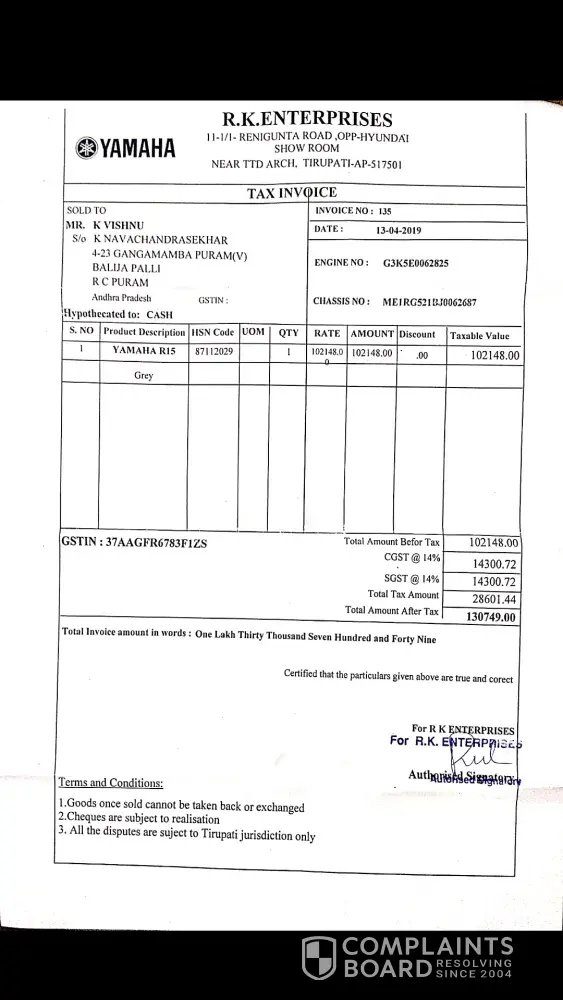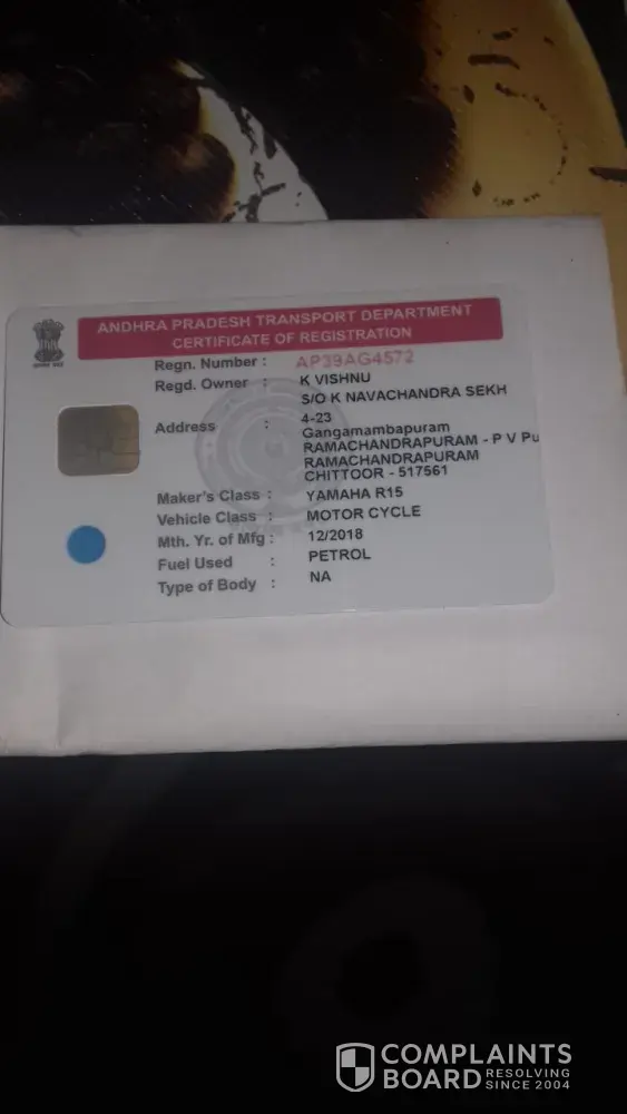 Hi this is K VISHNU, I am buying a new bike R15 V3 at Yamaha showroom RK Enterprises Tirupati, At the Date of Delivery (13 April 2019), I am paying for Full Amount of the Delivery time, But the showroom Executives without intemat giving 2018 Model Bike, when I was getting to post my RC card at the time I have seen On the card it's mention 2018 Manufacturing Date, I immediately contact to the show Room they was telling inresponsable Resions, I need explanation of wrong selling and Company further Step by this Issue.