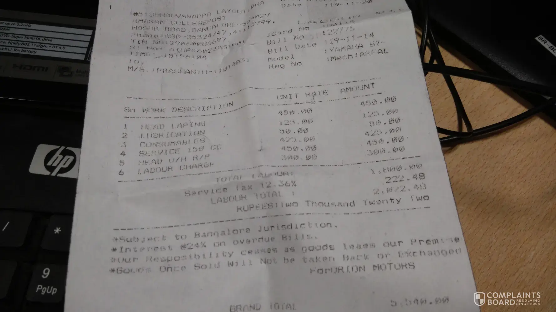 YAMAHA Motor - Bike service complaint against Perfect Riders, Bangalore 26/11/2009