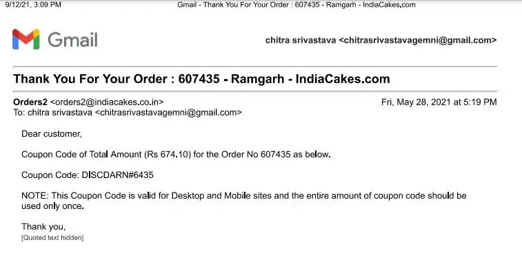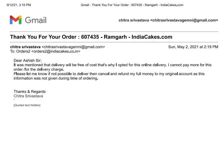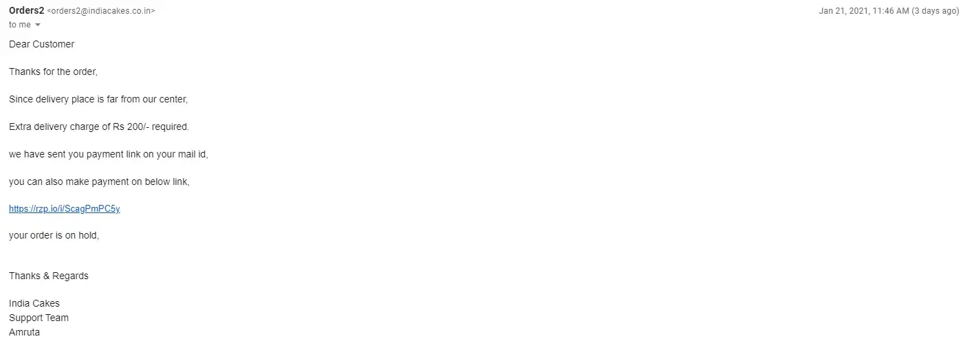 Secondley, on 11th September 2023, I placed an order at "indiacakes.com" for a cake. I made a payment of INR 945, selecting the normal delivery option. To my surprise, I was not informed about any additional delivery charges at the time of purchase. However, the day after, I received a notification requesting an additional payment of INR 275. I didn't made this additional payment, as it was not communicated to me during the initial transaction.