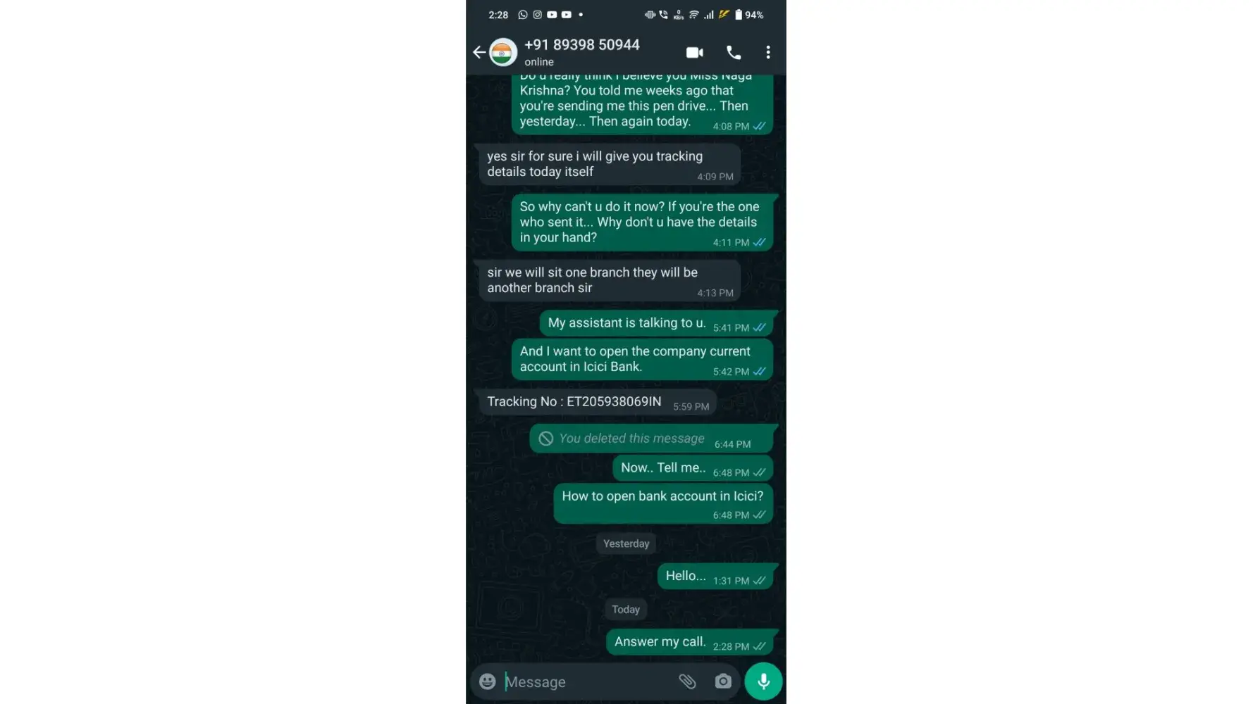 There is a person in the name of Anish, he only sends msgs but no clear communication overphone.