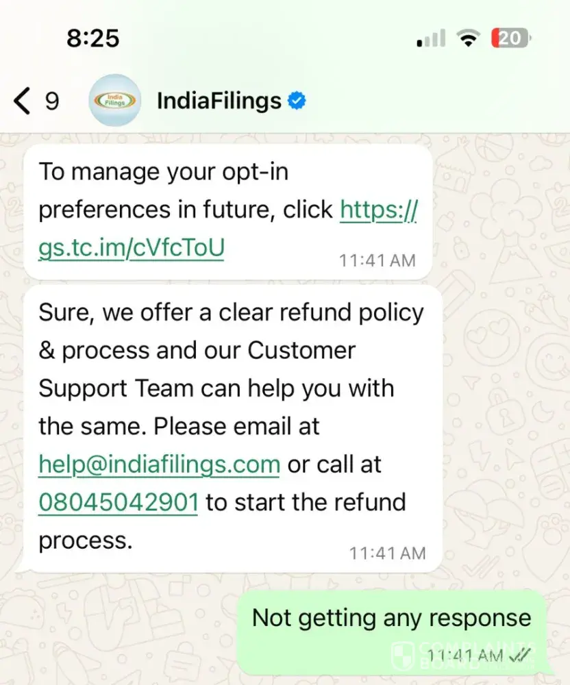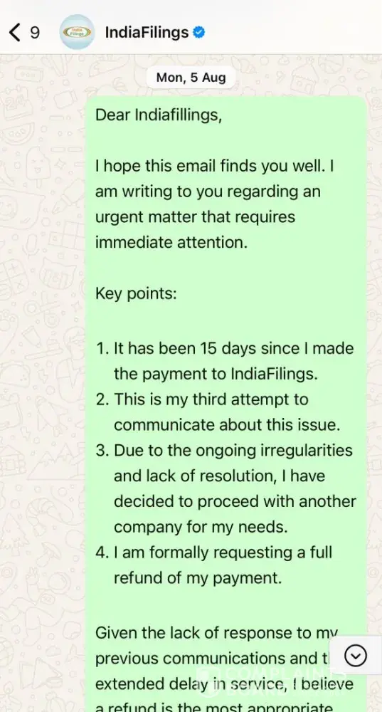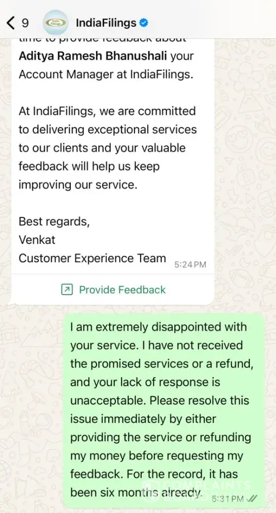 I had booked a Pvt Ltd registration package with India Filings in July 2024. Despite their initial claims and package agreement, they began demanding additional payments after the package was decided. This forced me to cancel the service and was assured that the refund was initiated, and I have been waiting for a refund ever since. I tried multiple time...